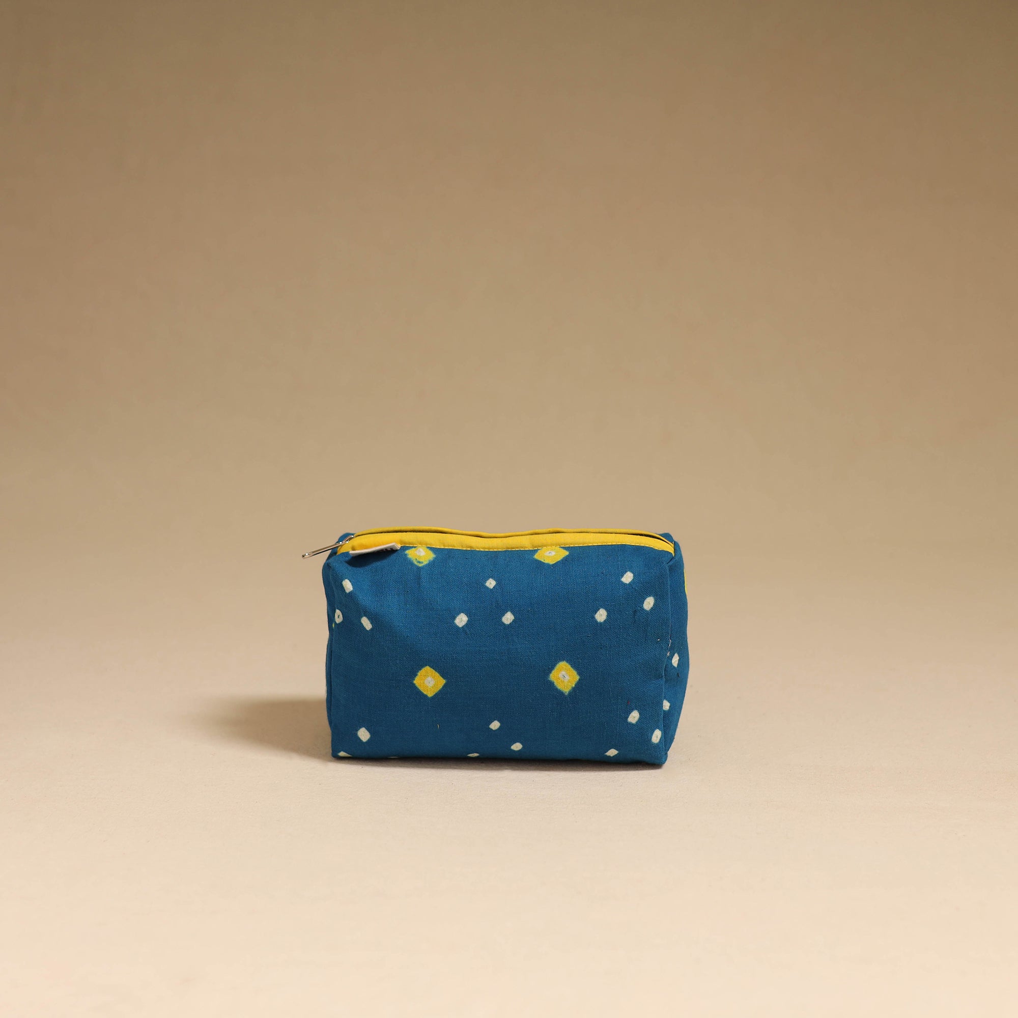 This blue handmade cotton toiletry pouch blends traditional artistry with everyday functionality, carefully made by skilled artisans. Featuring a waterproof lining and a sturdy zip closure, it keeps your daily essentials well-organized and protected, making it a perfect choice for both daily use and travel.