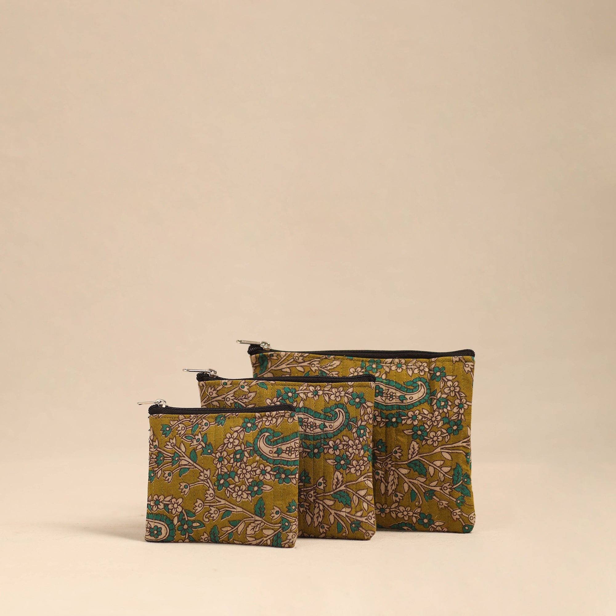 Stay organized with these green handmade multipurpose utility pouches, crafted from cotton fabric by skilled artisans. Ideal for storing makeup, jewelry, medicines, or stationery, this set offers both style and functionality. Featuring a foam layer lining for added protection and smooth zipper closures for easy access, these pouches reflect the craftsmanship and care of traditional handmade products. Add a touch of artisanal charm to your daily routine.