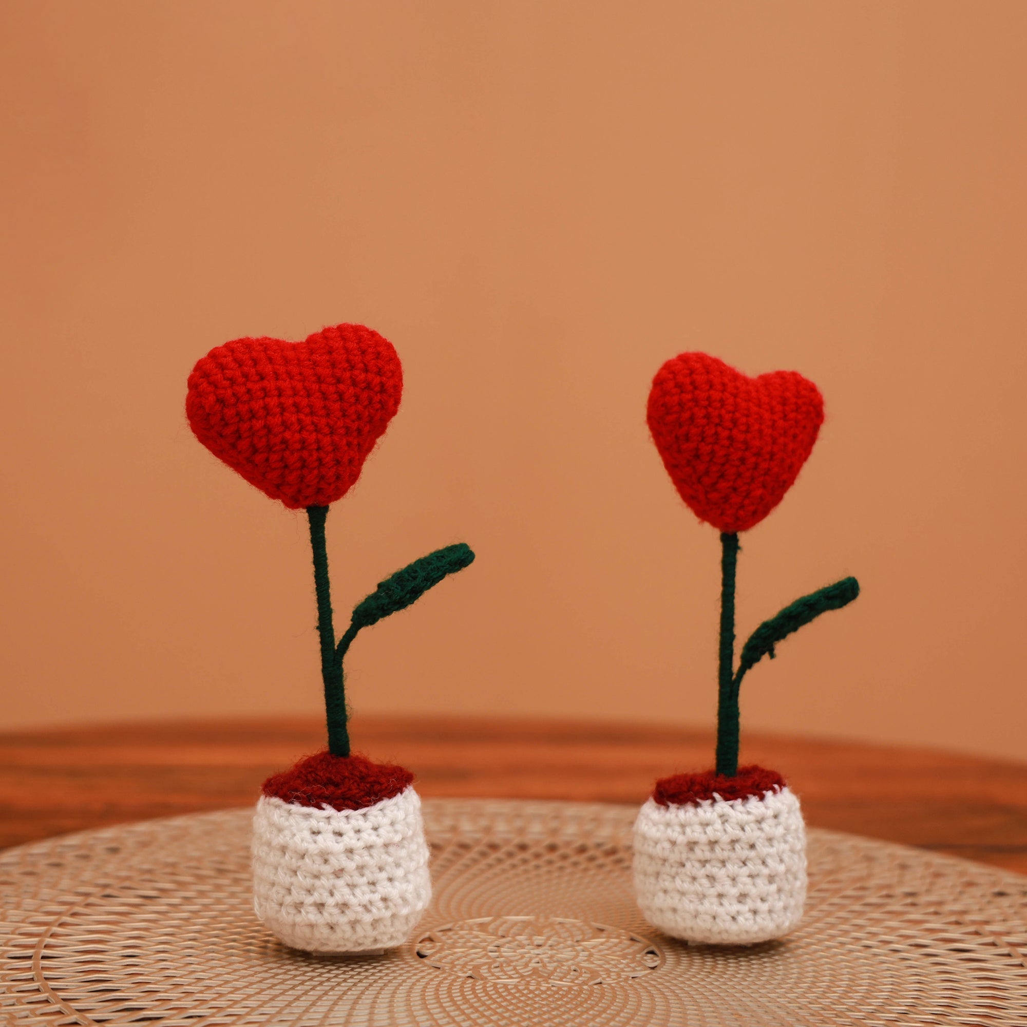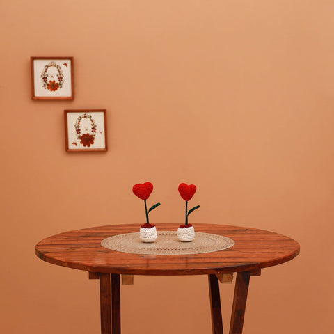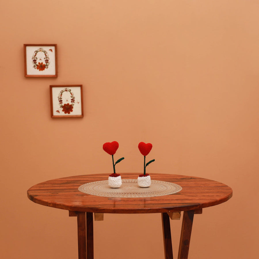 Handmade red crochet flower pots (set of 2). Each piece is meticulously made to bring a touch of everlasting beauty to any occasion. Perfect for home decor and gifting, these unique arrangements blend artistry with natural elegance.