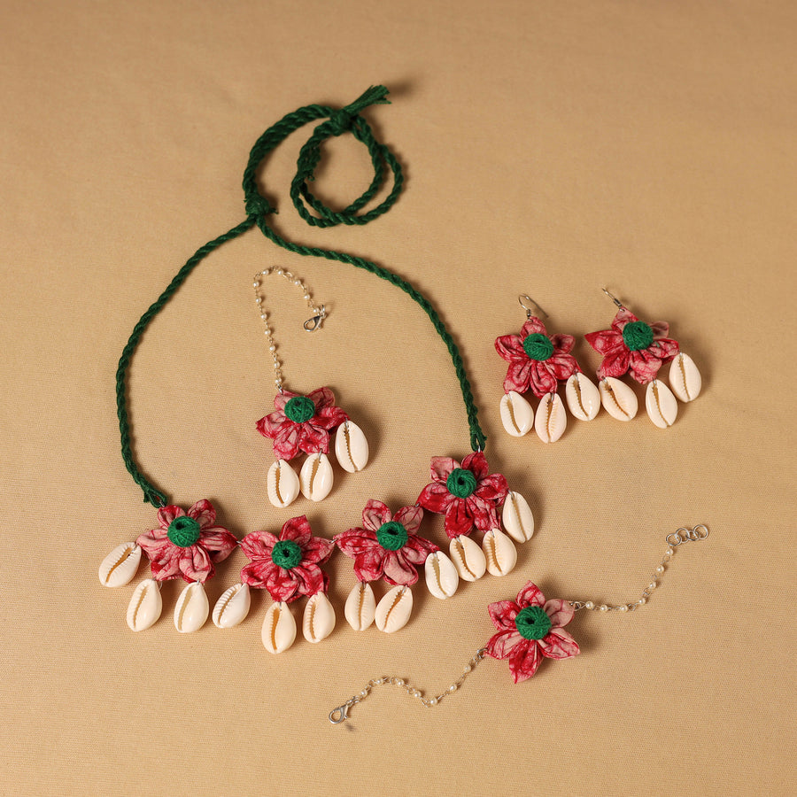 This pink handmade fabric floral jewellery set is crafted using delicate fabric flowers with shell and pearl accents, giving each piece a soft yet striking look. The set includes a matching necklace, earrings, maang teeka, and bracelet, perfect for haldi, mehendi, or festive occasions. Lightweight and comfortable to wear, this floral set adds a fresh, handcrafted charm to your look.
