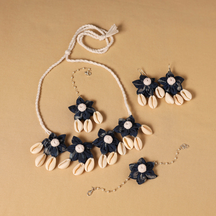 This multicolor handmade fabric floral jewellery set is crafted using delicate fabric flowers with shell and pearl accents, giving each piece a soft yet striking look. The set includes a matching necklace, earrings, maang teeka, and bracelet, perfect for haldi, mehendi, or festive occasions. Lightweight and comfortable to wear, this floral set adds a fresh, handcrafted charm to your look.