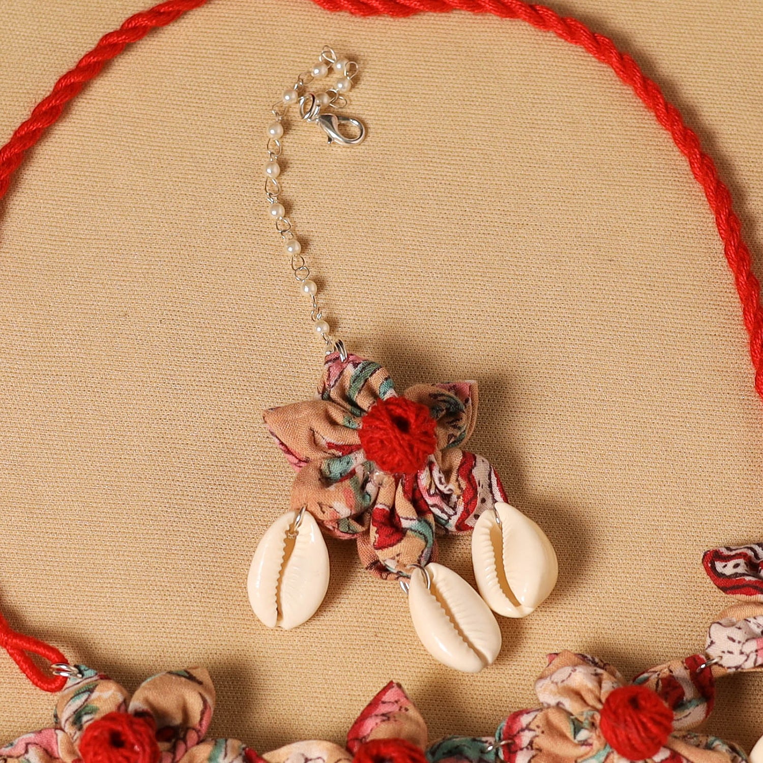 This red handmade fabric floral jewellery set is crafted using delicate fabric flowers with shell and pearl accents, giving each piece a soft yet striking look. The set includes a matching necklace, earrings, maang teeka, and bracelet, perfect for haldi, mehendi, or festive occasions. Lightweight and comfortable to wear, this floral set adds a fresh, handcrafted charm to your look.