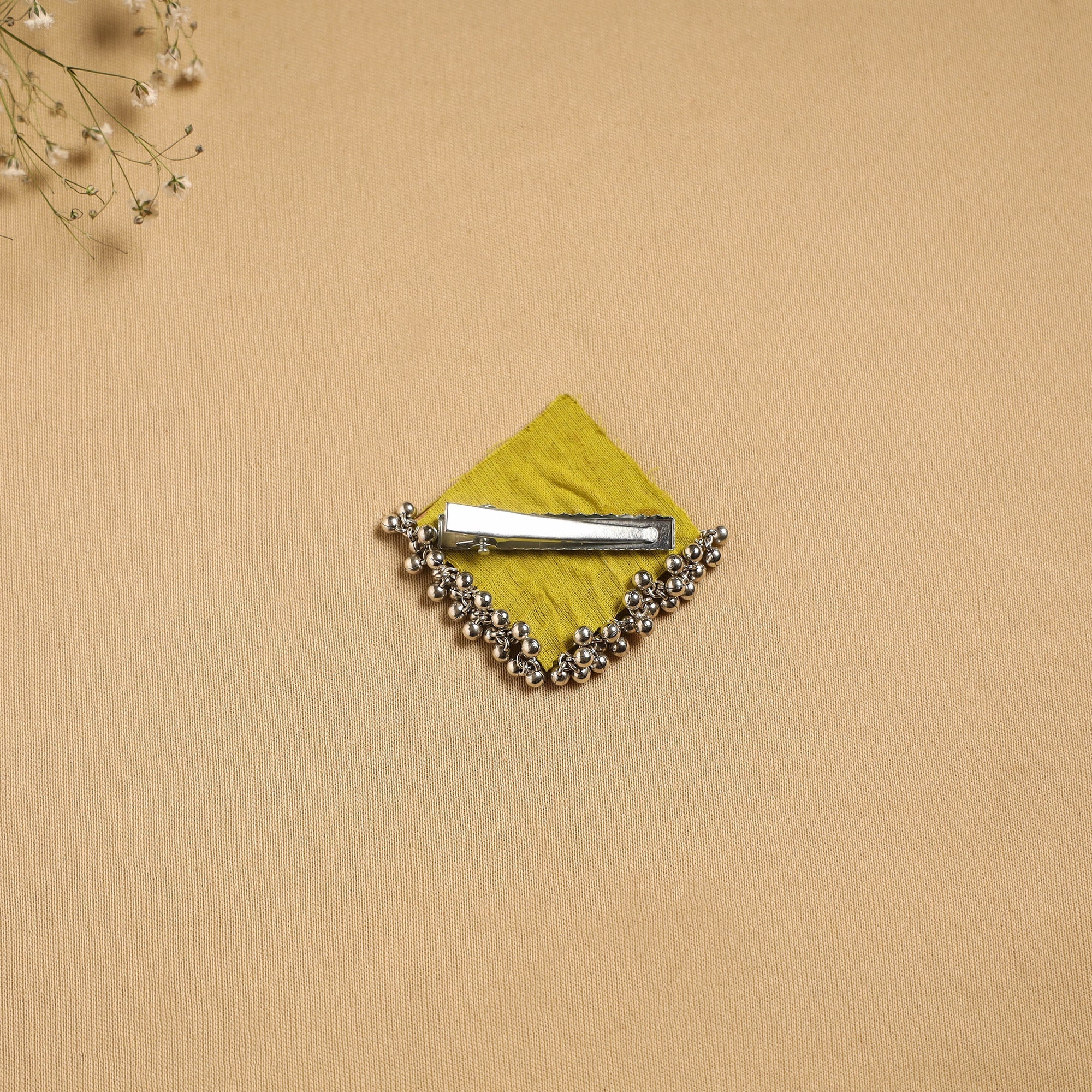 Green handmade hair clip adds a graceful touch to your hairstyle. Features intricate artistic details that may include fabric, ghungroo work or other decorative elements, reflecting the unique creativity of the maker.