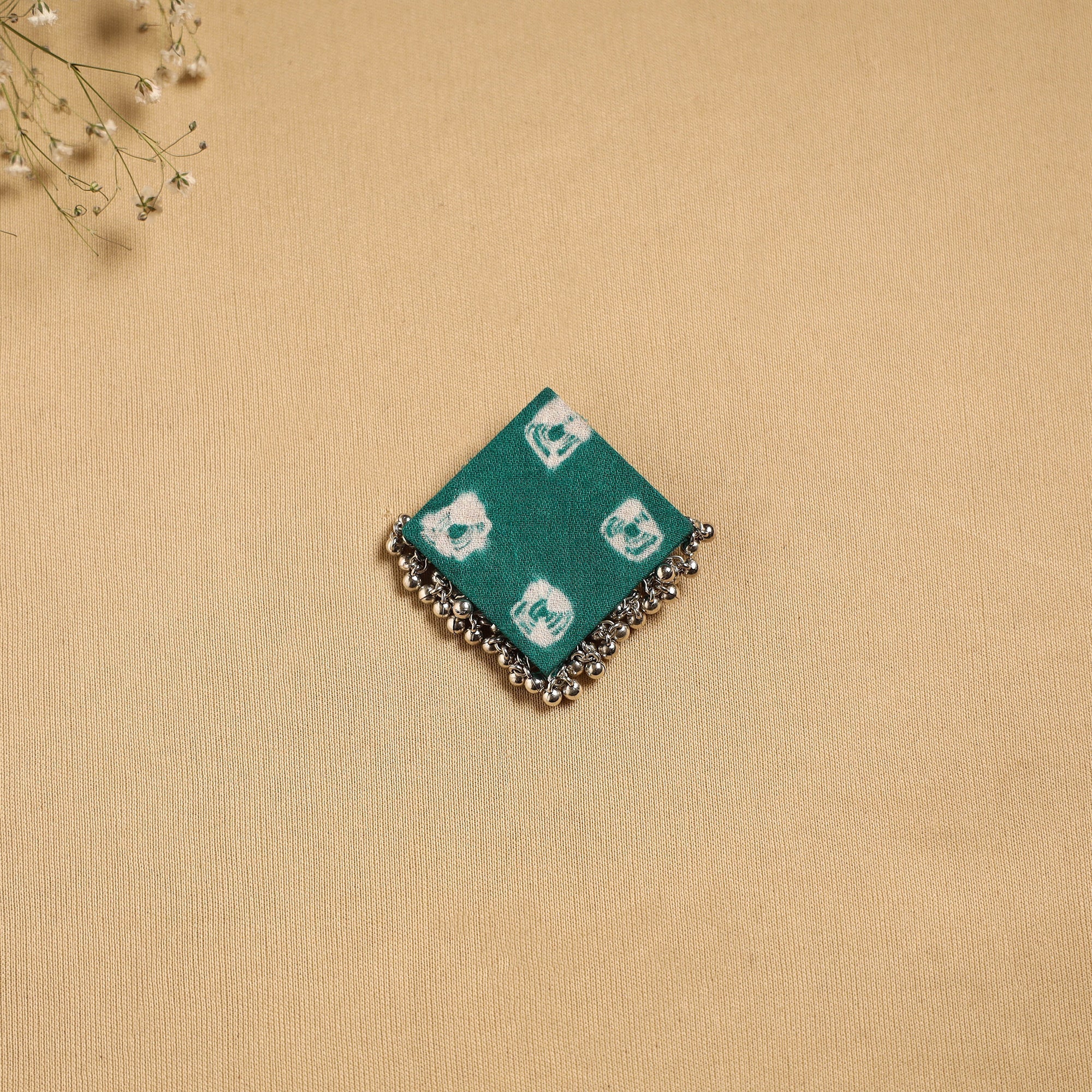 Green handmade hair clip adds a graceful touch to your hairstyle. Features intricate artistic details that may include fabric, ghungroo work or other decorative elements, reflecting the unique creativity of the maker.
