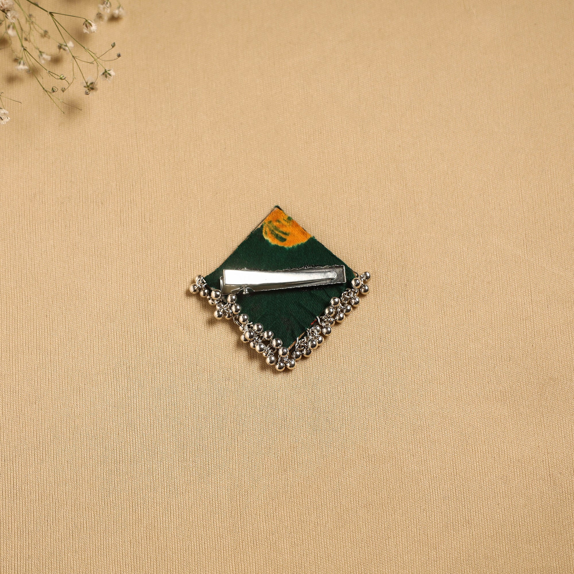 Handmade hair clip adds a graceful touch to your hairstyle. Features intricate artistic details that may include fabric, ghungroo work or other decorative elements, reflecting the unique creativity of the maker.