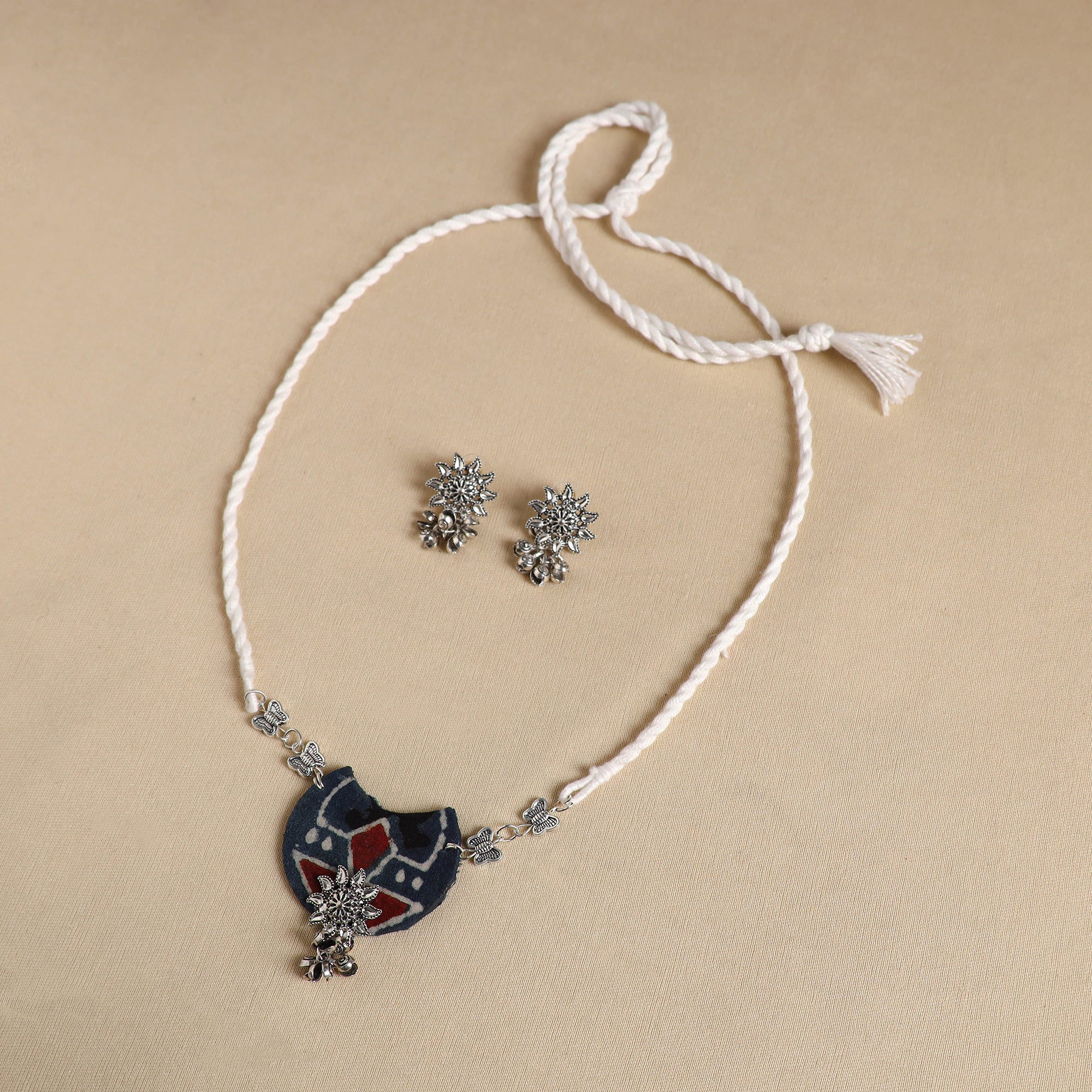 Complete your look with this white handcrafted fabart necklace set. It features a thread necklace paired with a vibrant fabric pendant and matching earrings. German silver accents add charm, making it perfect for festive occasions or everyday elegance with a touch of handmade flair.