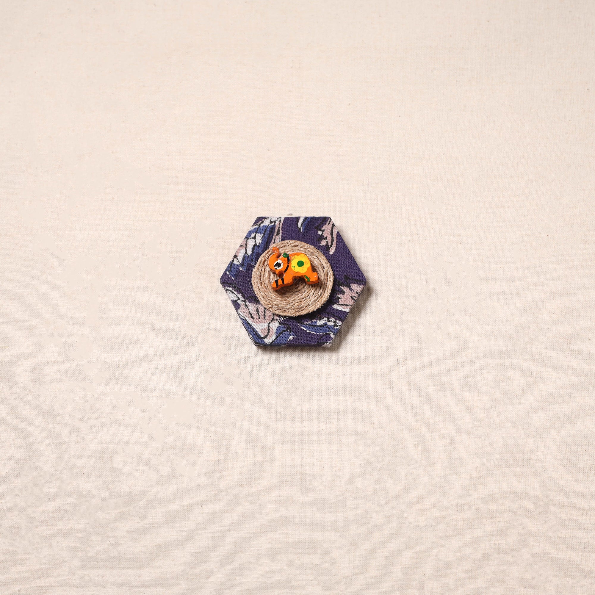 This decorative magnet is made with a strong wooden base and covered with fabric on top. Jute work and small decorative details add a beautiful touch. It can be used on fridge doors, office boards, workstations or magnetic boards to hold notes, photos or reminders while adding a decorative look to your space.