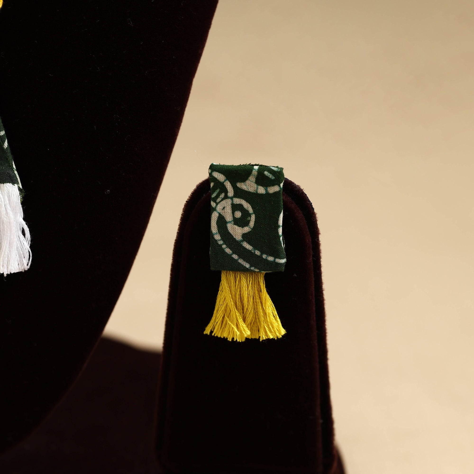 Complete your ethnic look with this green handcrafted fabart necklace set. It features a thread necklace paired with a vibrant fabric pendant and matching earrings. Delicate thread tassel accents add charm, making it perfect for festive occasions or everyday elegance with a touch of handmade flair.