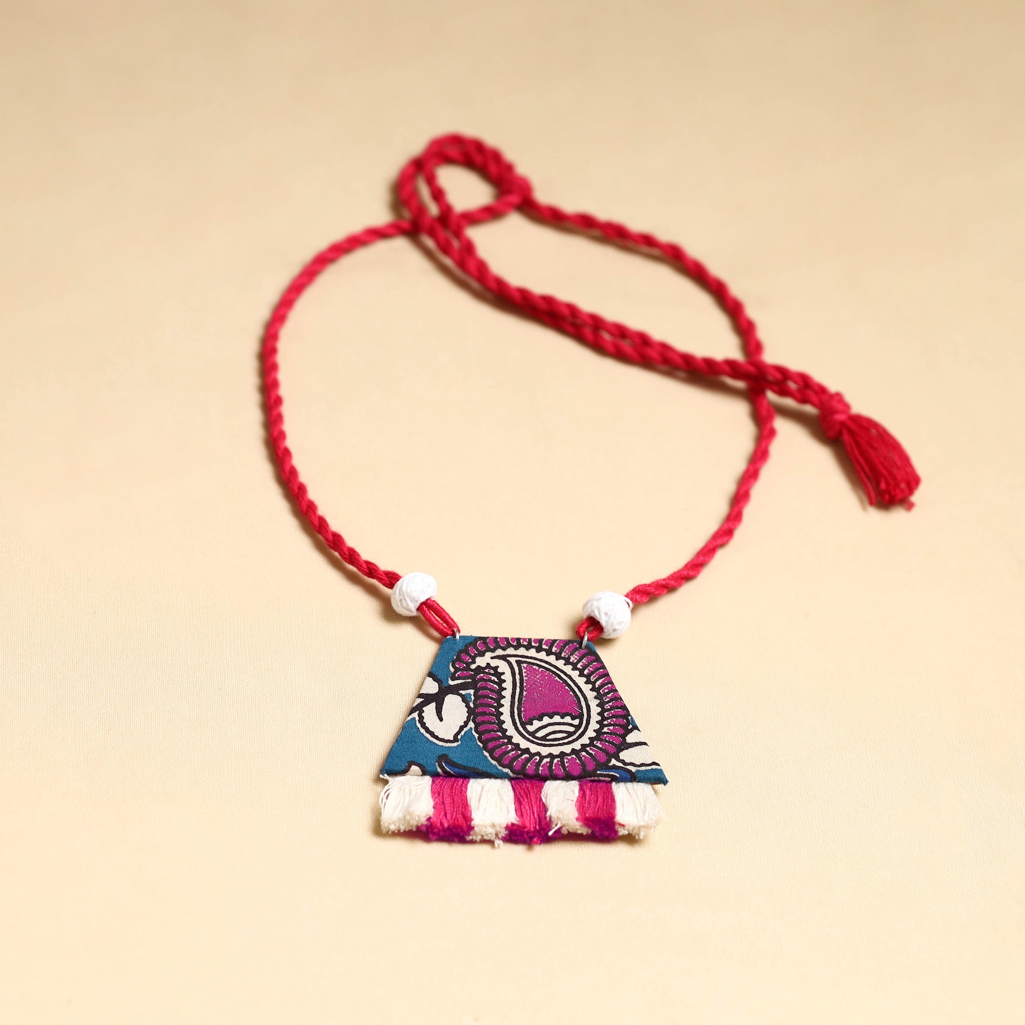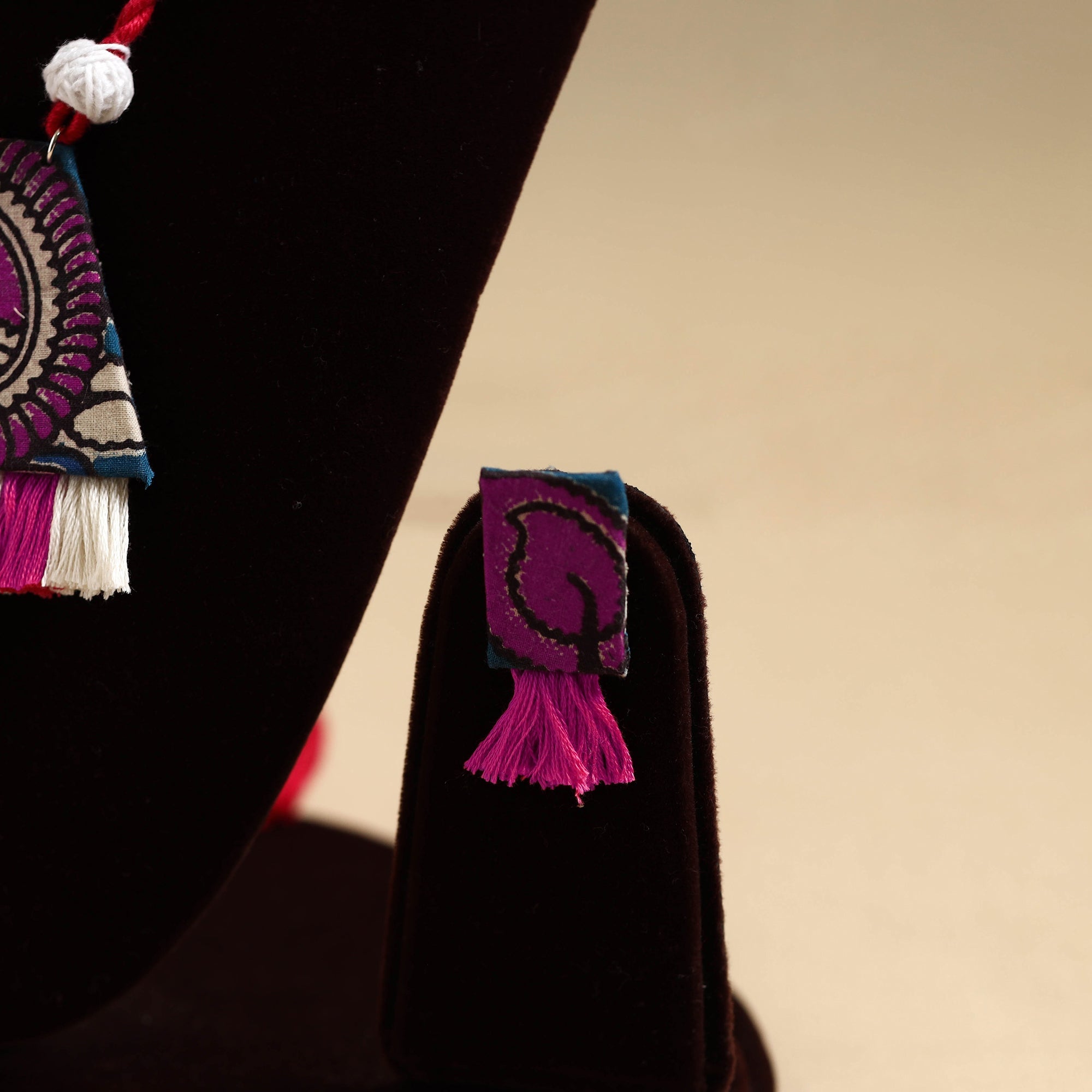 Complete your ethnic look with this pink handcrafted fabart necklace set. It features a thread necklace paired with a vibrant fabric pendant and matching earrings. Delicate thread tassel accents add charm, making it perfect for festive occasions or everyday elegance with a touch of handmade flair.