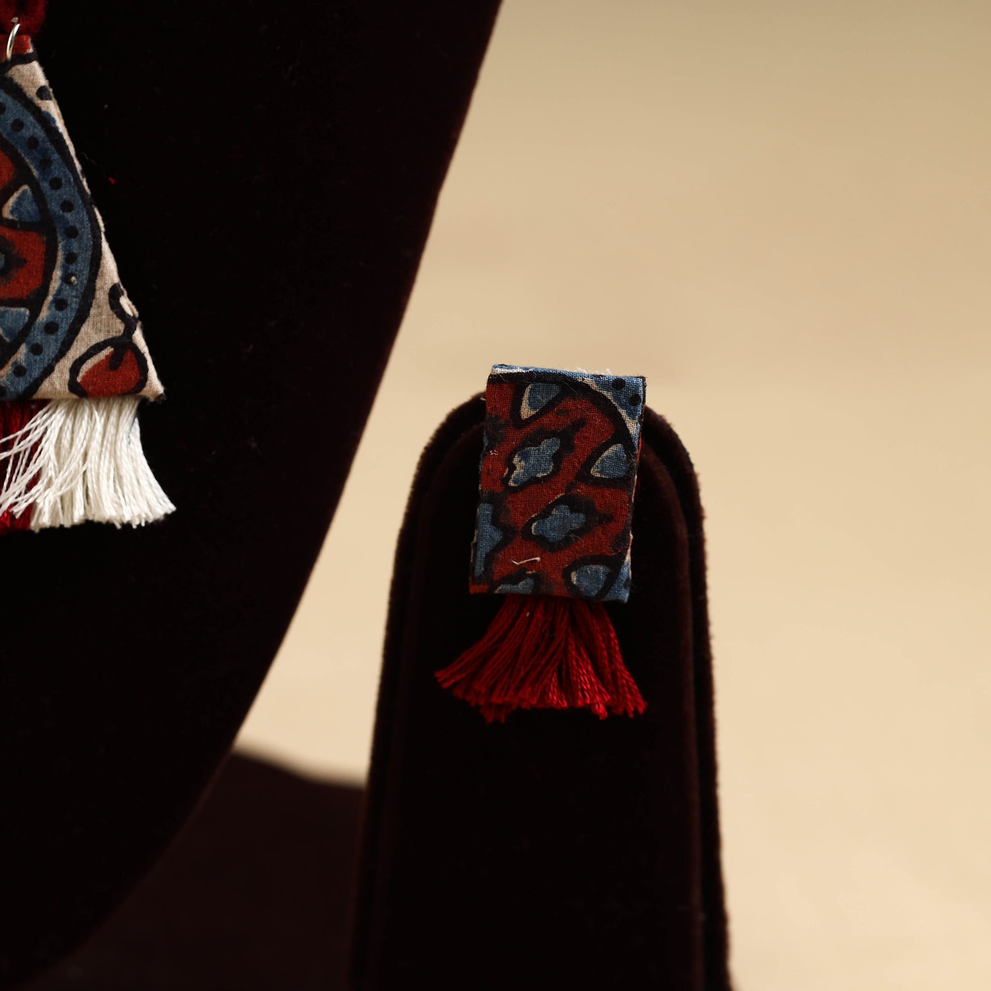 Complete your ethnic look with this red handcrafted fabart necklace set. It features a thread necklace paired with a vibrant fabric pendant and matching earrings. Delicate thread tassel accents add charm, making it perfect for festive occasions or everyday elegance with a touch of handmade flair.
