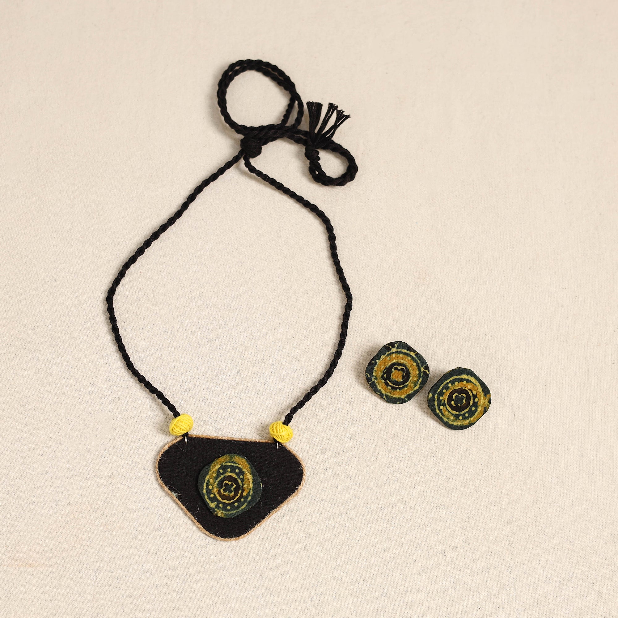 Elevate your ethnic look with this handcrafted green necklace set featuring a fabric pendant known for its vibrant textures and artisanal touch. Paired with matching earrings, it’s perfect for festive occasions, cultural events, or adding a distinctive charm to everyday outfits.