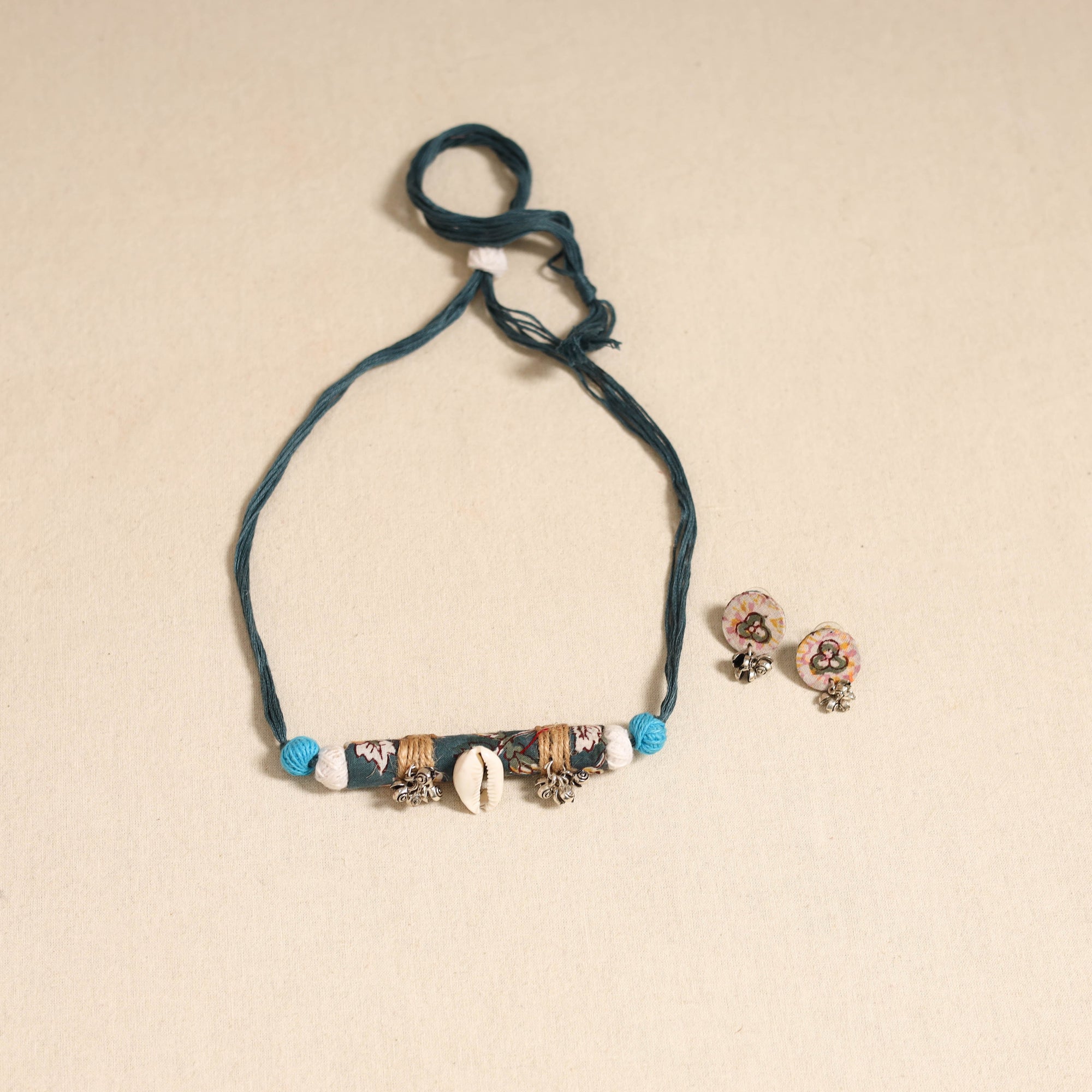 Elevate your ethnic look with this green handcrafted fabric necklace set featuring delicate shell details. Complete with matching earrings, it becomes an elegant choice for festive occasions, cultural programs, or adding effortless charm.