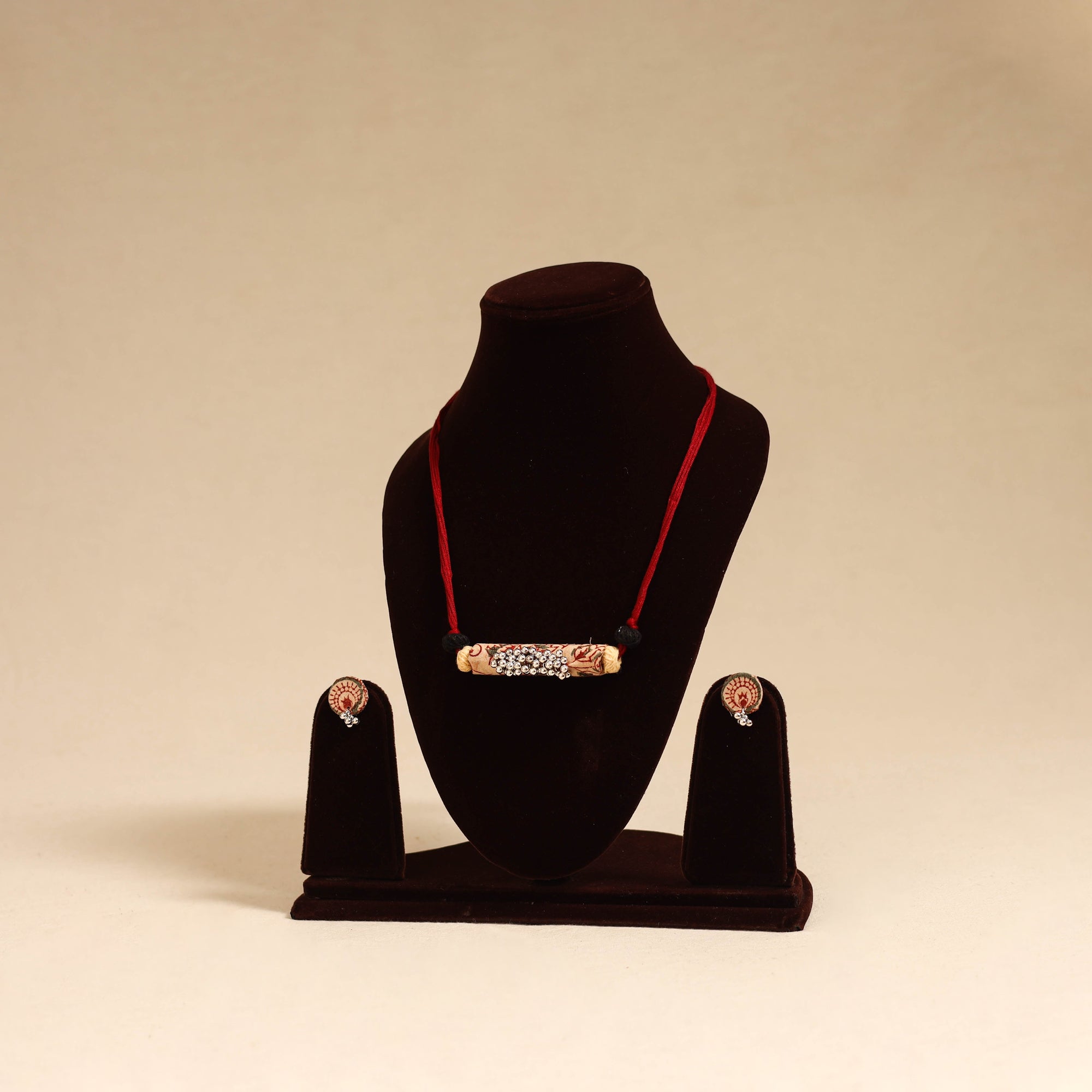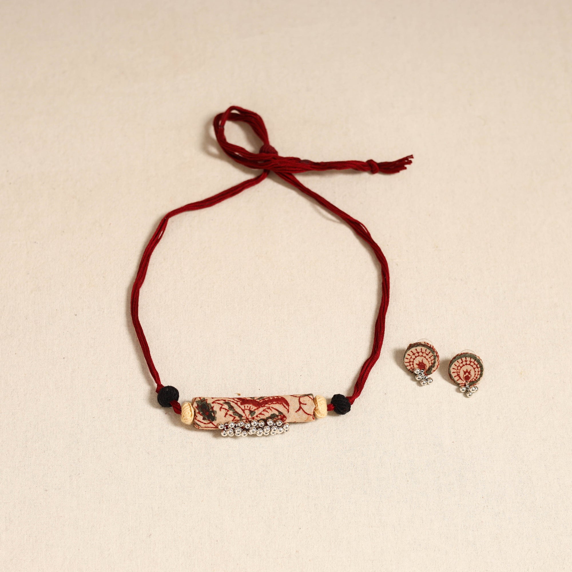 Elevate your ethnic look with this red handcrafted fabric necklace set featuring delicate shell details. Complete with matching earrings, it becomes an elegant choice for festive occasions, cultural programs, or adding effortless charm.