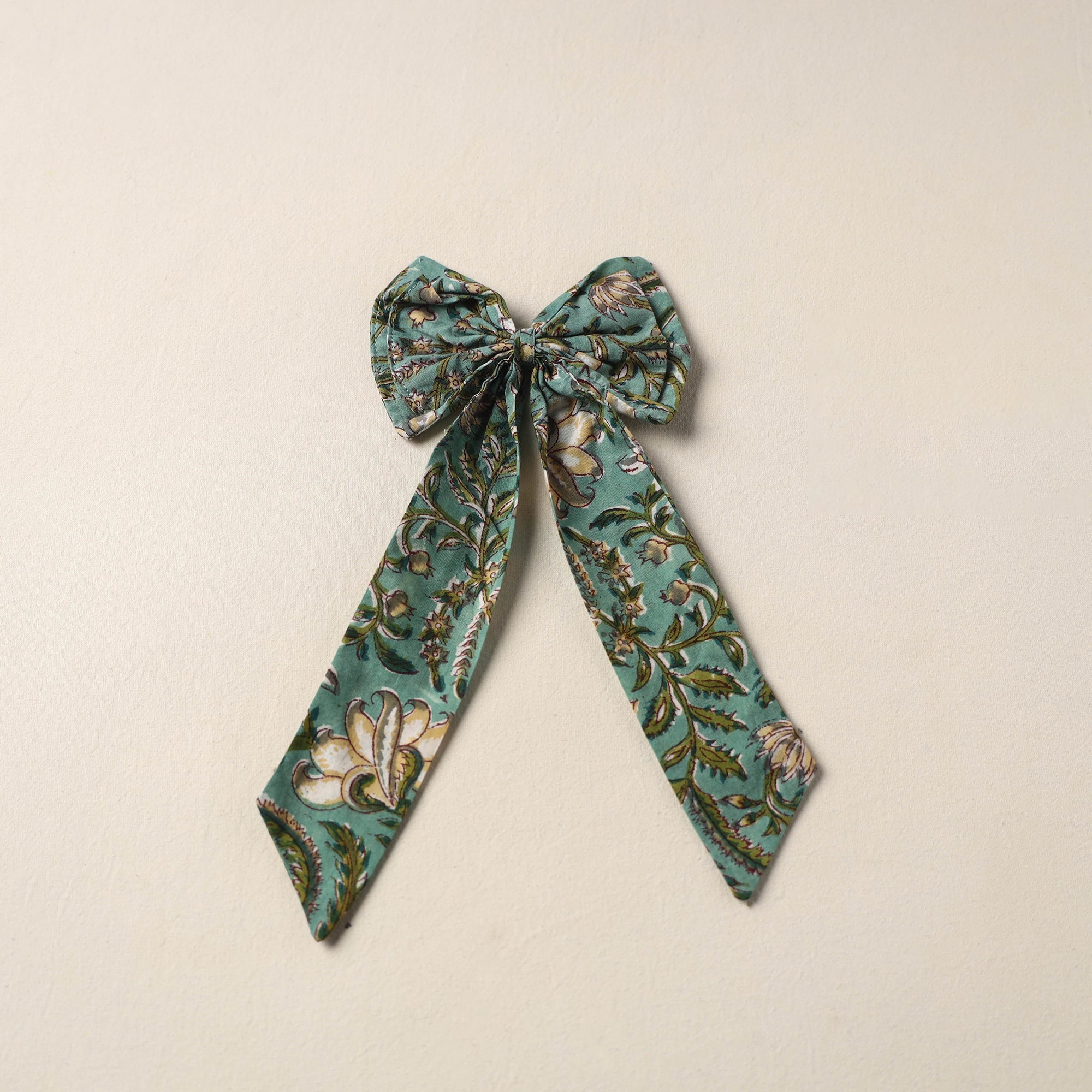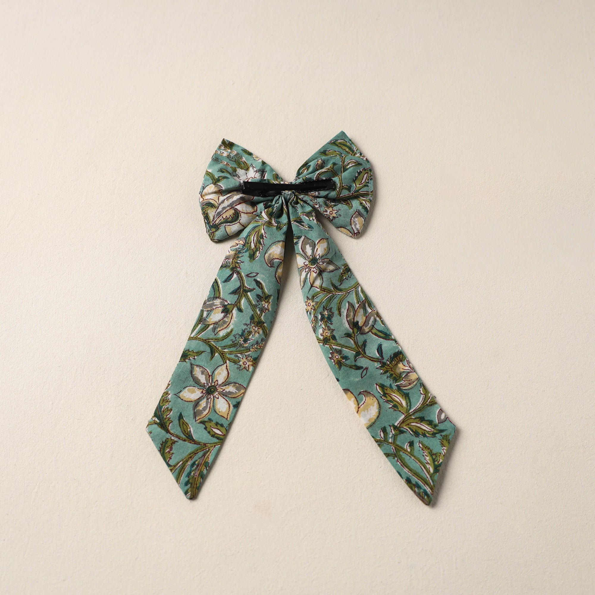 This green fabric bow hair clip adds a cute, artisanal flair to your hairdos. Hand-stitched by skilled artisans with traditional fabric work, it's comfy to wear and pairs well with casual outfits, be it for everyday looks, weekend plans, or laid-back college days.