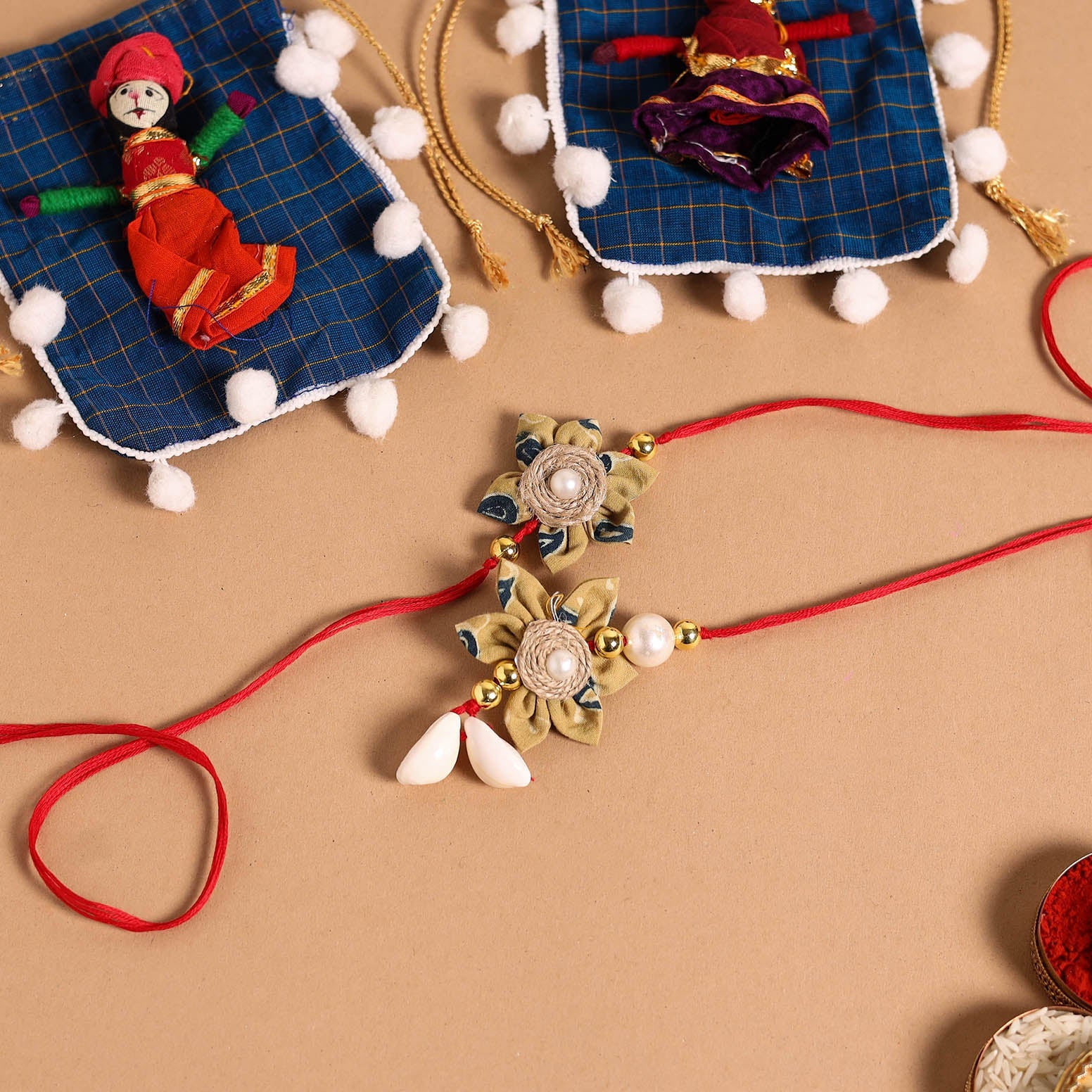 Celebrate the timeless bond of love and tradition with this handmade fabric flower jute rakhi and lumba set. Designed in vibrant colours and intricate patterns, it beautifully symbolises care, affection, and festive spirit. Ideal for Raksha Bandhan, this set offers a heartfelt way to express your love. It also includes a potli for gifting.