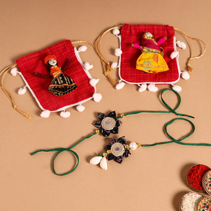 Celebrate the timeless bond of love and tradition with this handmade fabric flower jute rakhi and lumba set. Designed in vibrant colours and intricate patterns, it beautifully symbolises care, affection, and festive spirit. Ideal for Raksha Bandhan, this set offers a heartfelt way to express your love. It also includes a potli for gifting.
