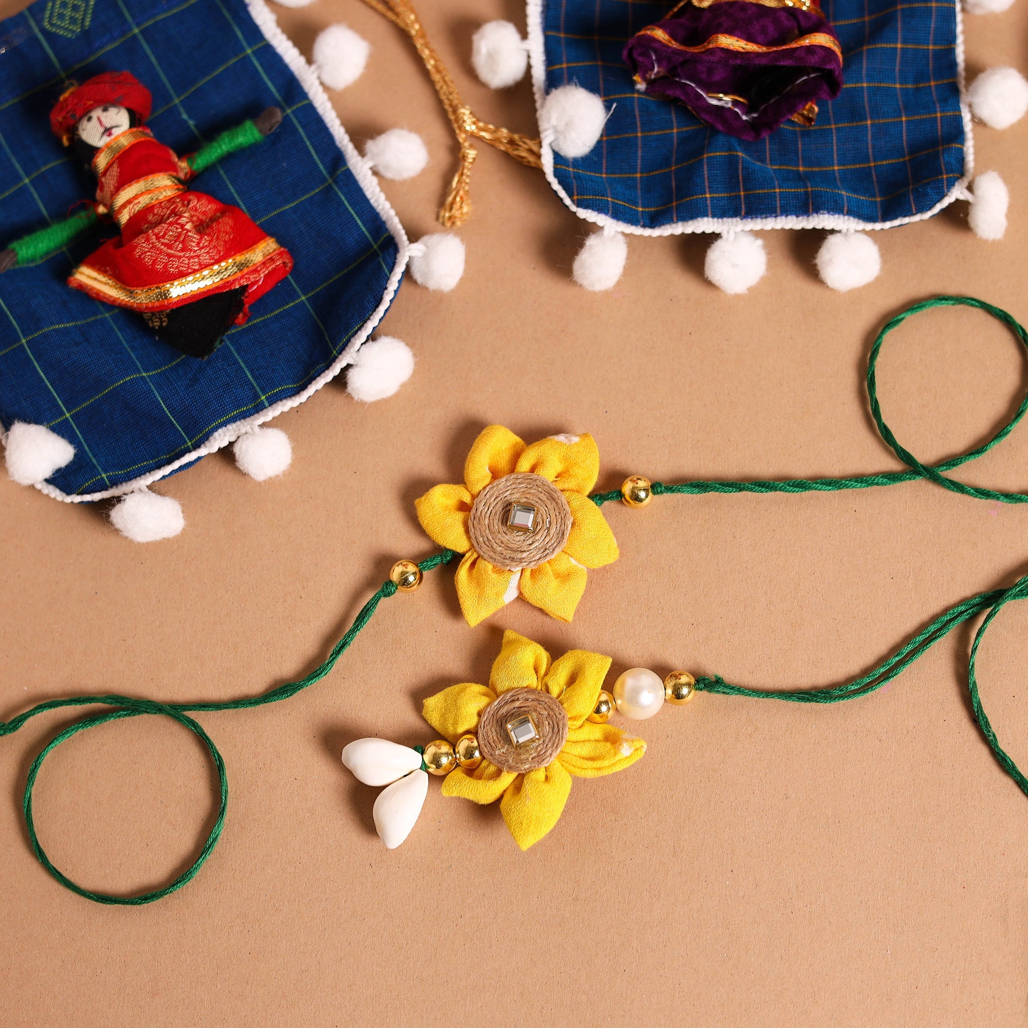 •  Handmade Fabric Flower Jute Rakhi & Lumba Set