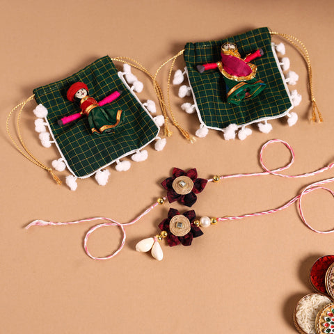 Celebrate the timeless bond of love and tradition with this handmade fabric flower jute rakhi and lumba set. Designed in vibrant colours and intricate patterns, it beautifully symbolises care, affection, and festive spirit. Ideal for Raksha Bandhan, this set offers a heartfelt way to express your love. It also includes a potli for gifting.