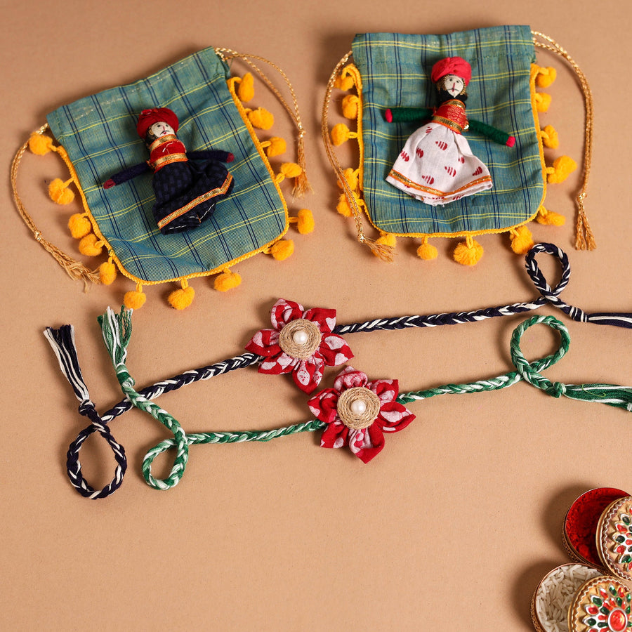 Celebrate the bond of love and tradition with this handmade fabric flower jute rakhi (set of 2). Crafted in vibrant colours and intricate patterns, this set beautifully symbolises care, affection, and the festive spirit. Perfect for Raksha Bandhan, it’s a meaningful way to express your love. The set includes a potli for gifting.