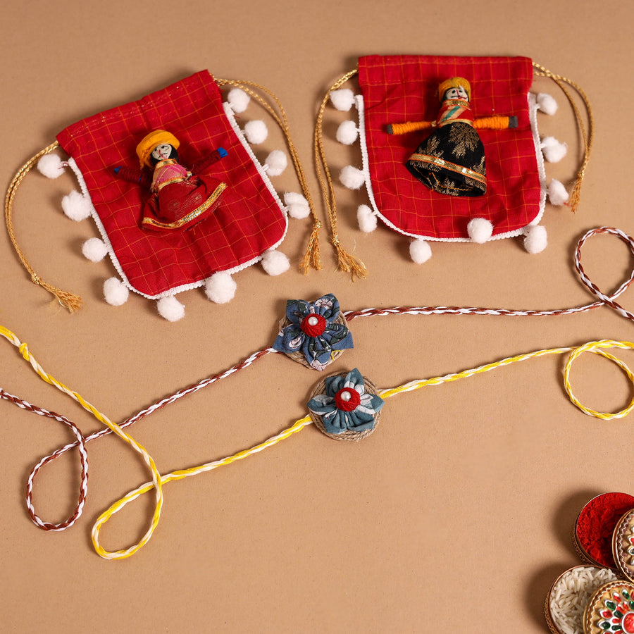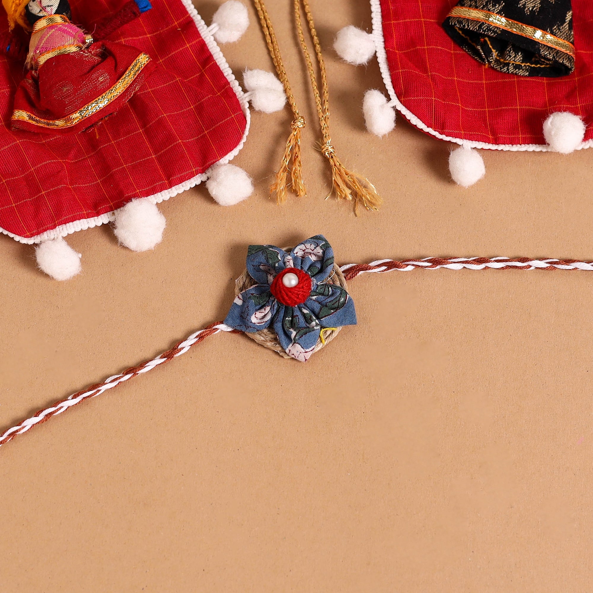 •  Handmade Fabric Flower Jute Rakhi (Set of 2)