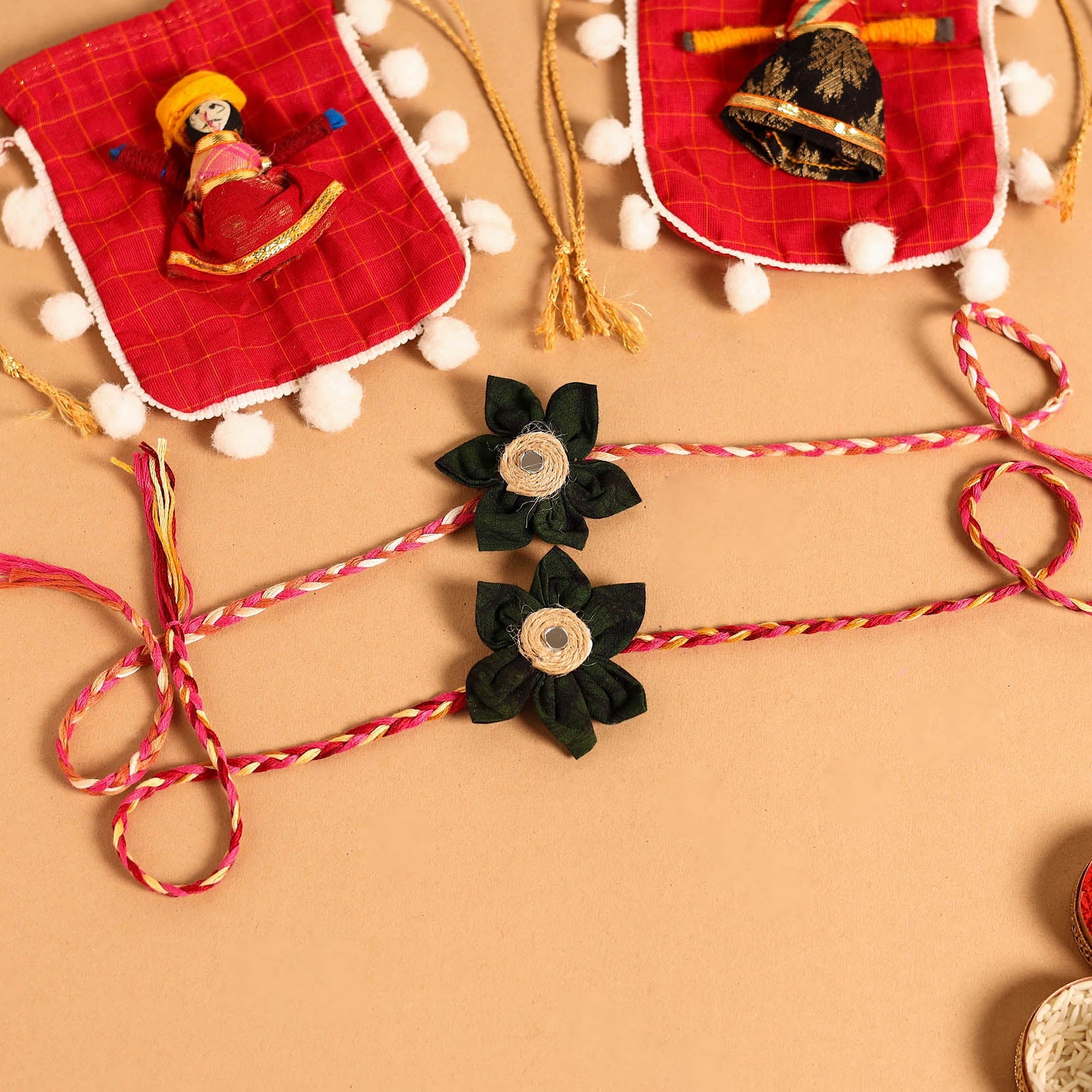 •  Handmade Fabric Flower Jute Rakhi (Set of 2)