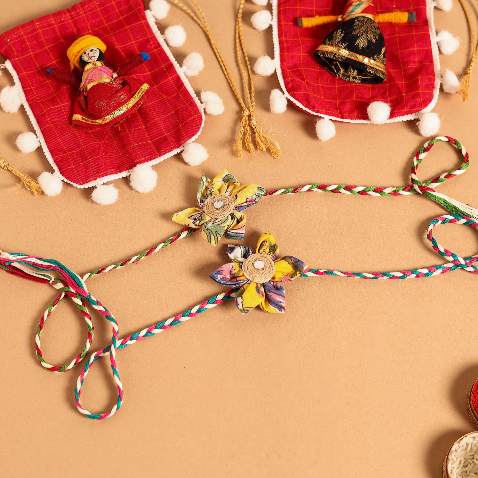 •  Handmade Fabric Flower Jute Rakhi (Set of 2)