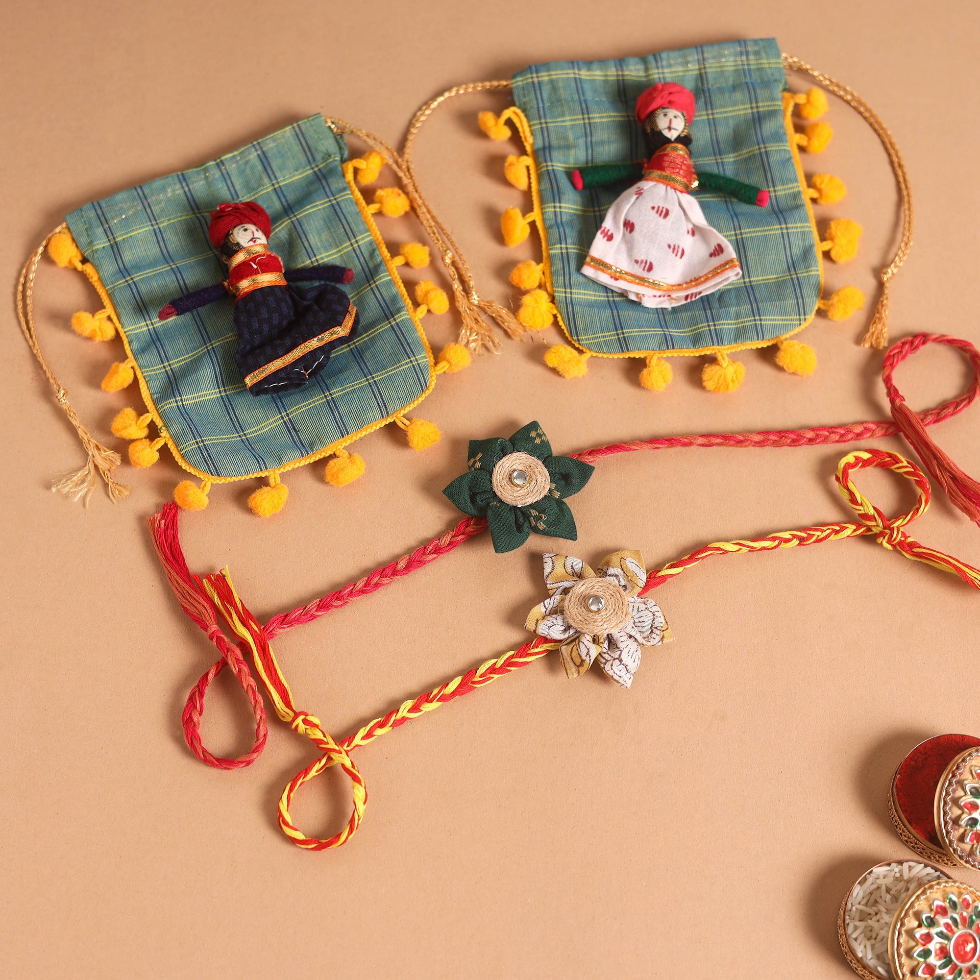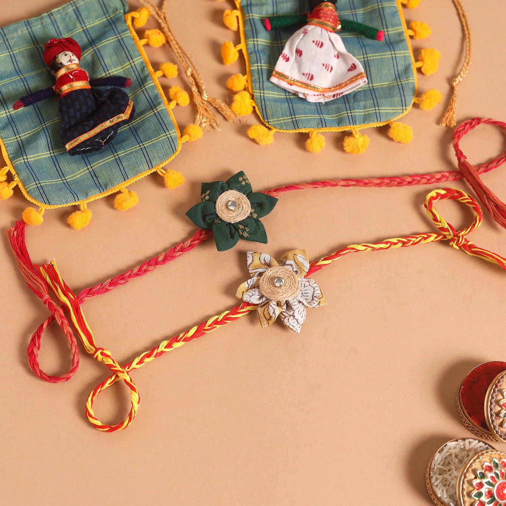 •  Handmade Fabric Flower Jute Rakhi (Set of 2)