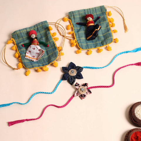 Material  Description Celebrate the bond of love with this handmade fabric flower Rakhi set. Designed with intricate patterns and vibrant colors, this Rakhi adds a special touch to your festivities. The set includes a potli, making it a perfect gift. Whether for a sibling or a loved one, this Rakhi beautifully symbolizes care and tradition.