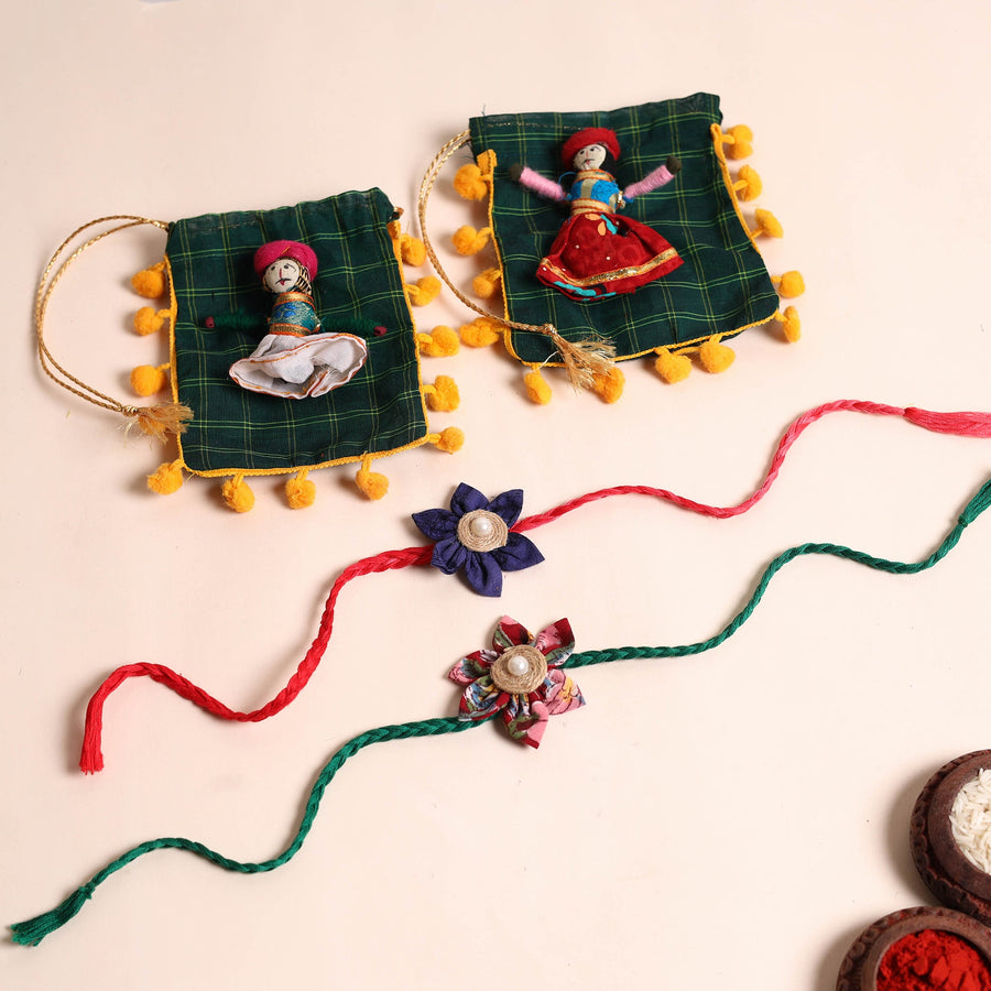 Material  Description Celebrate the bond of love with this handmade fabric flower Rakhi set. Designed with intricate patterns and vibrant colors, this Rakhi adds a special touch to your festivities. The set includes a potli, making it a perfect gift. Whether for a sibling or a loved one, this Rakhi beautifully symbolizes care and tradition.