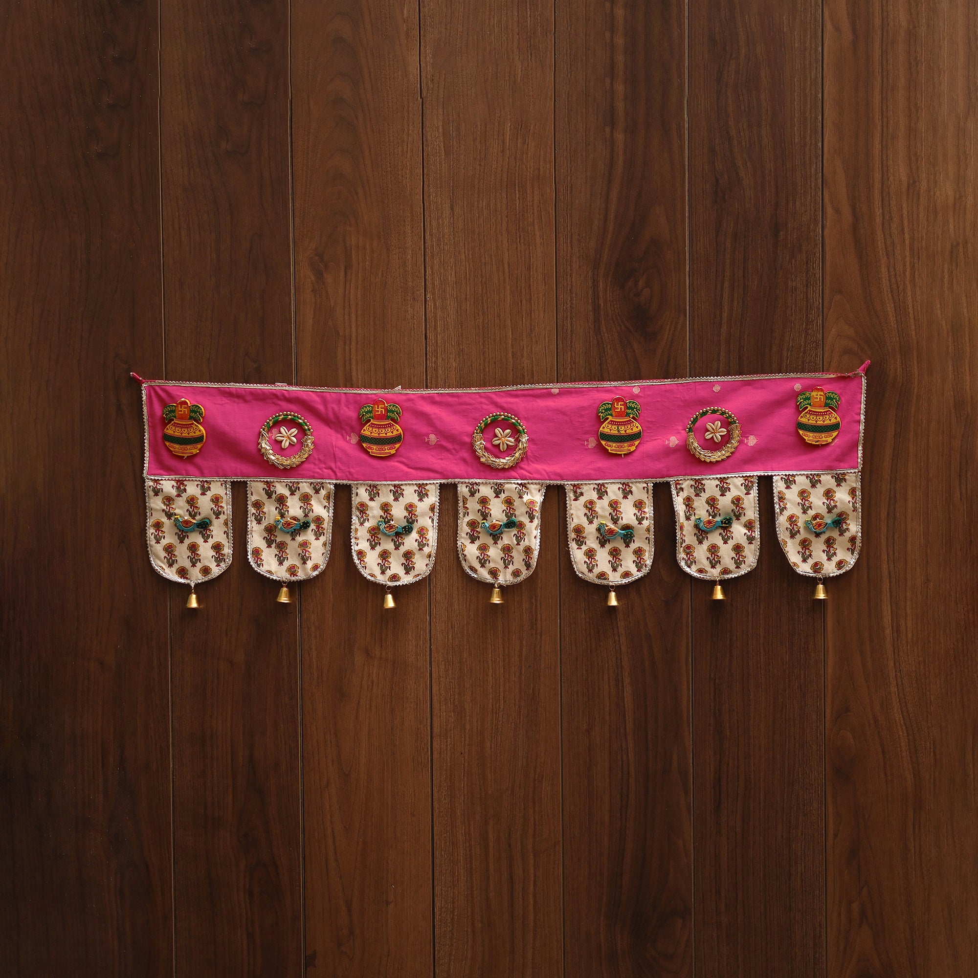 This beautiful toran adds a touch of tradition to your home. Made using vibrant fabrics, it features delicate gota patti work, pom-poms, tiny mirrors, and shells. Designed by skilled artisans, this decorative piece enhances your doorway or living space, adding a festive and welcoming charm with its colorful, handcrafted design.