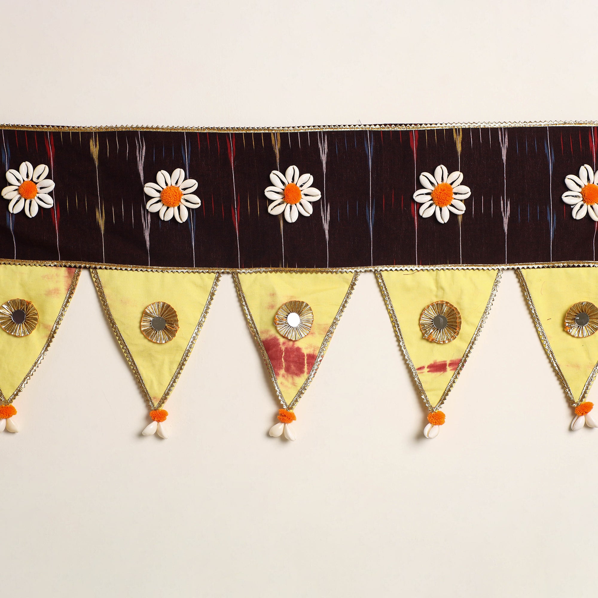 Celebrate tradition and color with this handcrafted toran, made with lovely fabrics and decorated with fine gota patti work, colorful pom-poms, tiny mirrors, and shells. Designed by skilled artisans, it’s the perfect accent for brightening up your doorway or living room.