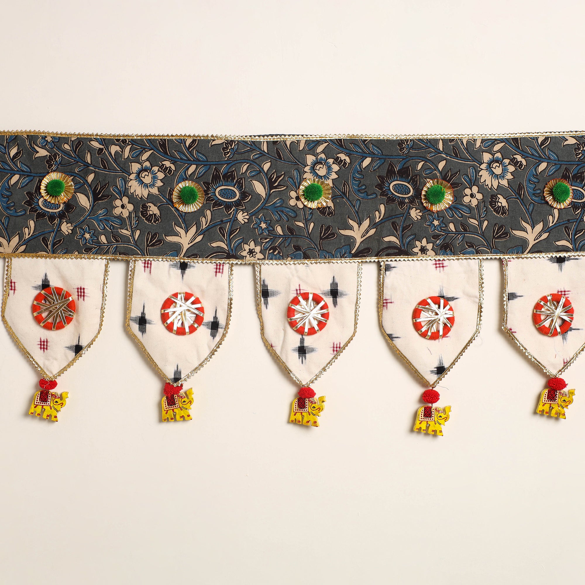 Celebrate tradition and color with this handcrafted toran, made with lovely fabrics and decorated with fine gota patti work, colorful pom-poms, tiny mirrors, and shells. Designed by skilled artisans, it’s the perfect accent for brightening up your doorway or living room.