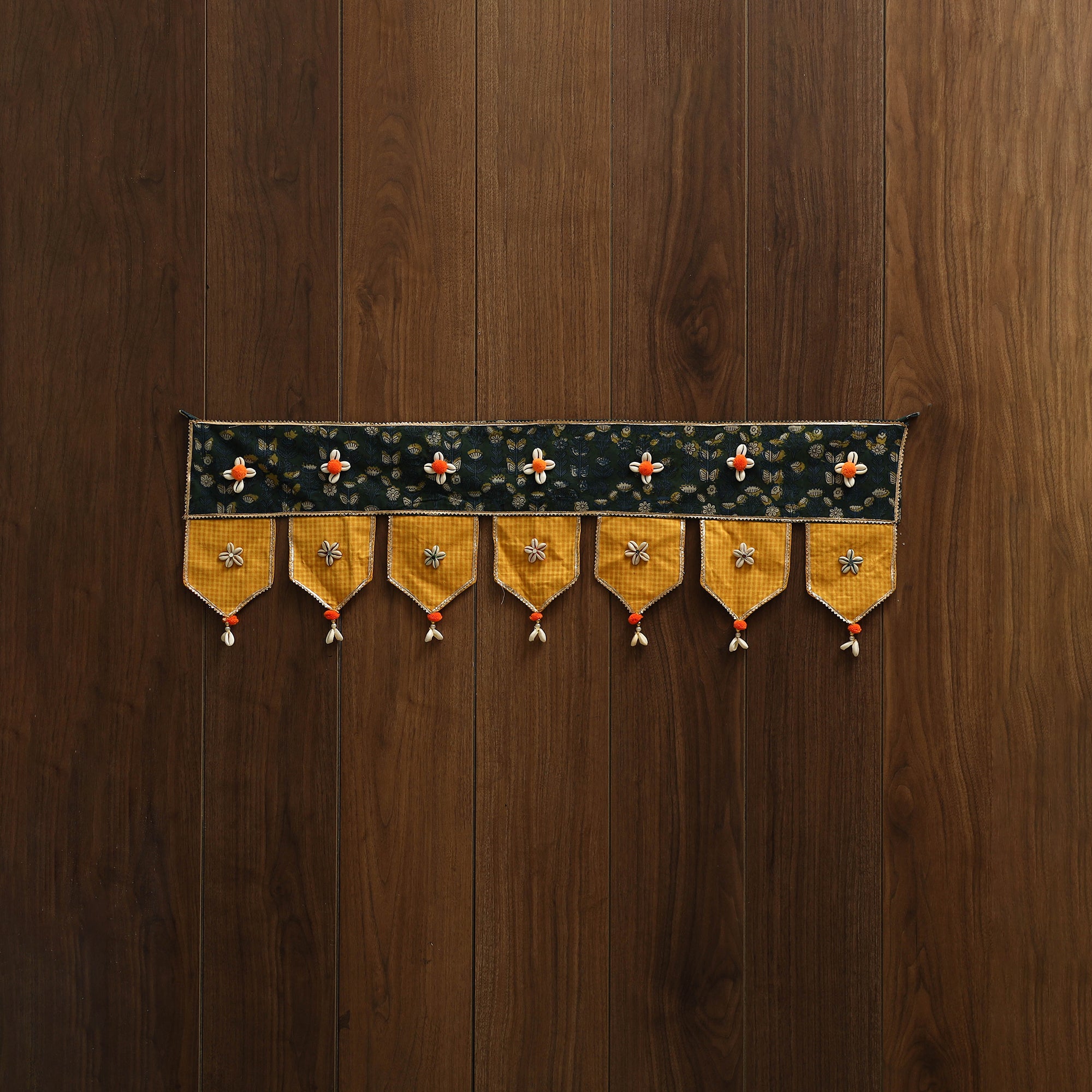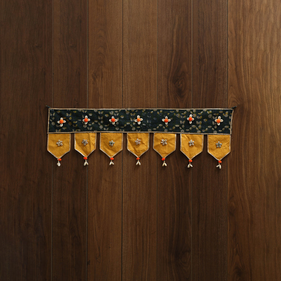 This beautiful toran adds a touch of tradition to your home. Made using vibrant fabrics, it features delicate gota patti work, pom-poms, tiny mirrors, and shells. Designed by skilled artisans, this decorative piece enhances your doorway or living space, adding a festive and welcoming charm with its colorful, handcrafted design.