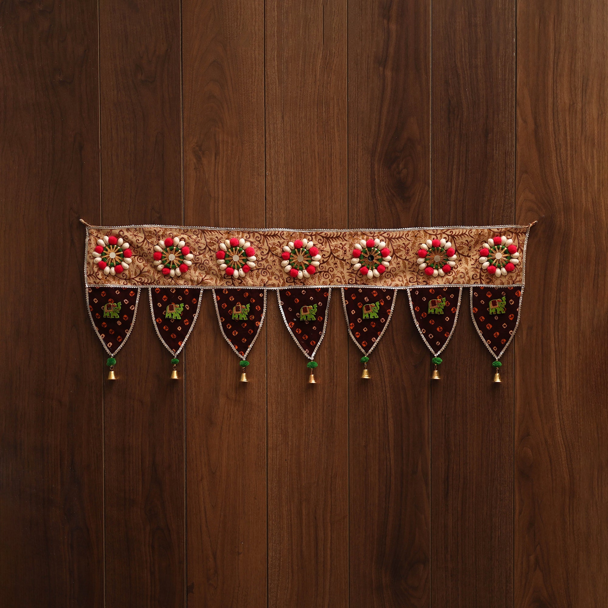 This beautiful toran adds a touch of tradition to your home. Made using vibrant fabrics, it features delicate gota patti work, pom-poms, tiny mirrors, and shells. Designed by skilled artisans, this decorative piece enhances your doorway or living space, adding a festive and welcoming charm with its colorful, handcrafted design.