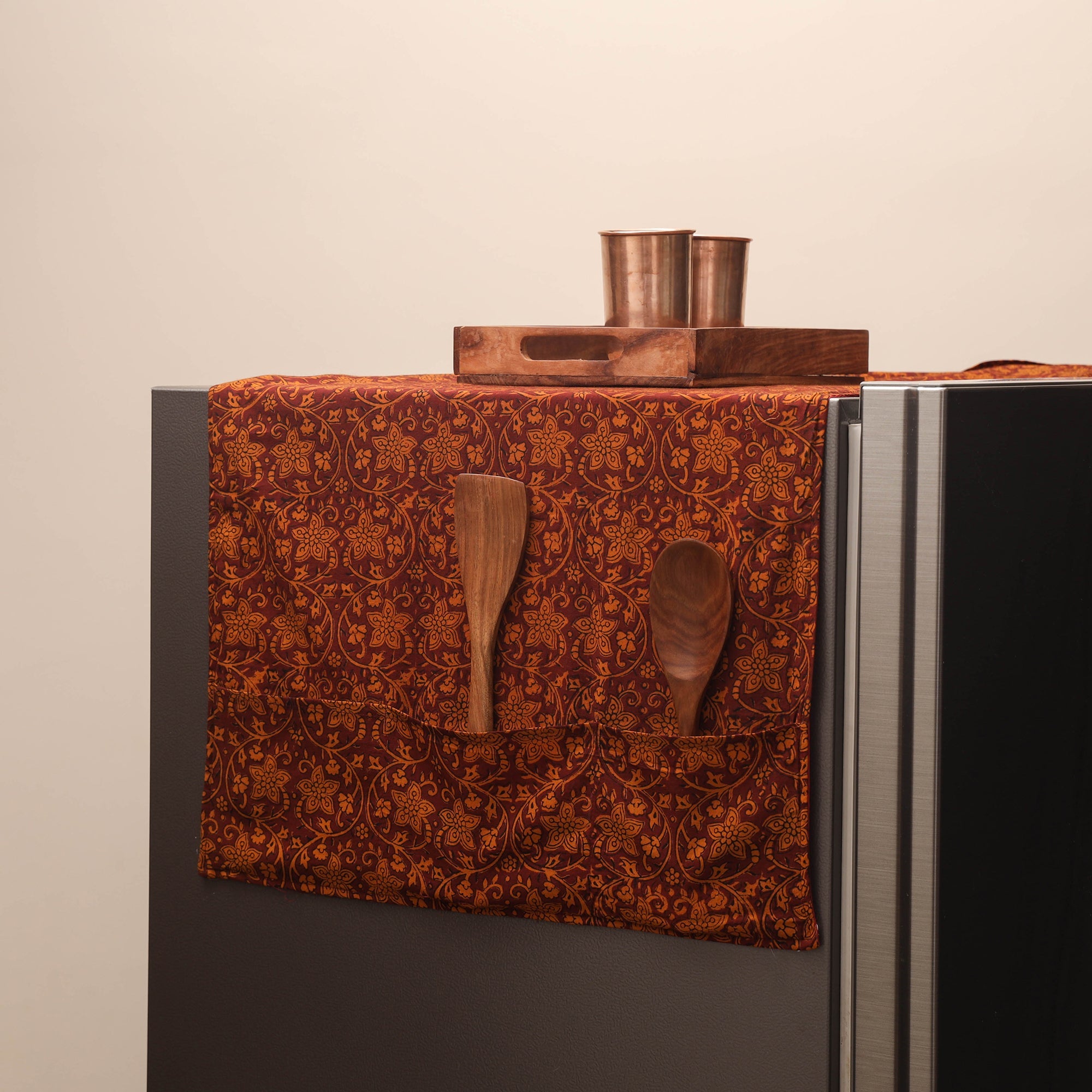 Handmade fridge top cover is made from artisanal indian cotton fabrics. It helps protect your fridge from dust, stains and everyday marks. The six stitched pockets provide convenient storage for small kitchen tools or other daily-use items.