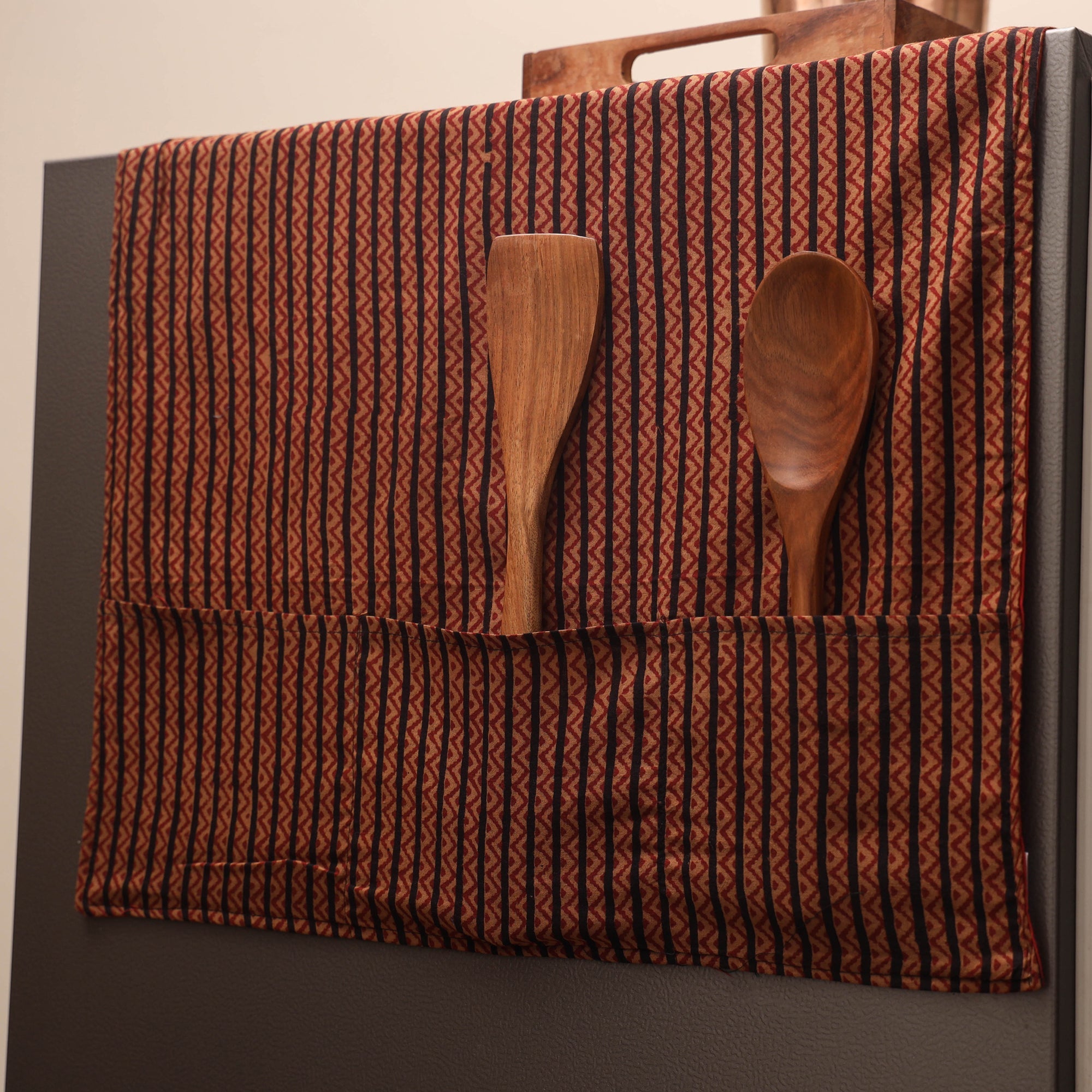 Brown handmade fridge top cover is made from artisanal indian cotton fabrics. It helps protect your fridge from dust, stains and everyday marks. The six stitched pockets provide convenient storage for small kitchen tools or other daily-use items.