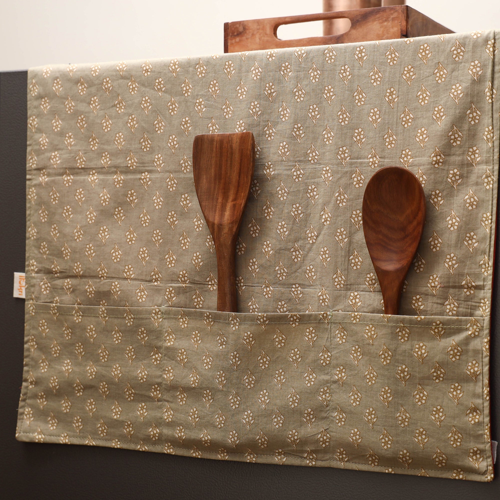 Handmade fridge top cover is made from sanganeri hand block print cotton fabric. It helps protect your fridge from dust, stains and everyday marks. The six stitched pockets provide convenient storage for small kitchen tools and other daily-use items.
