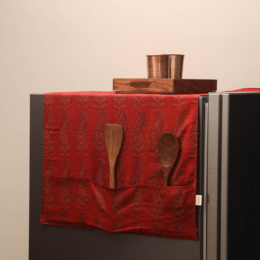 Handmade fridge top cover is made from artisanal indian cotton fabrics. It helps protect your fridge from dust, stains and everyday marks. The six stitched pockets provide convenient storage for small kitchen tools or other daily-use items.