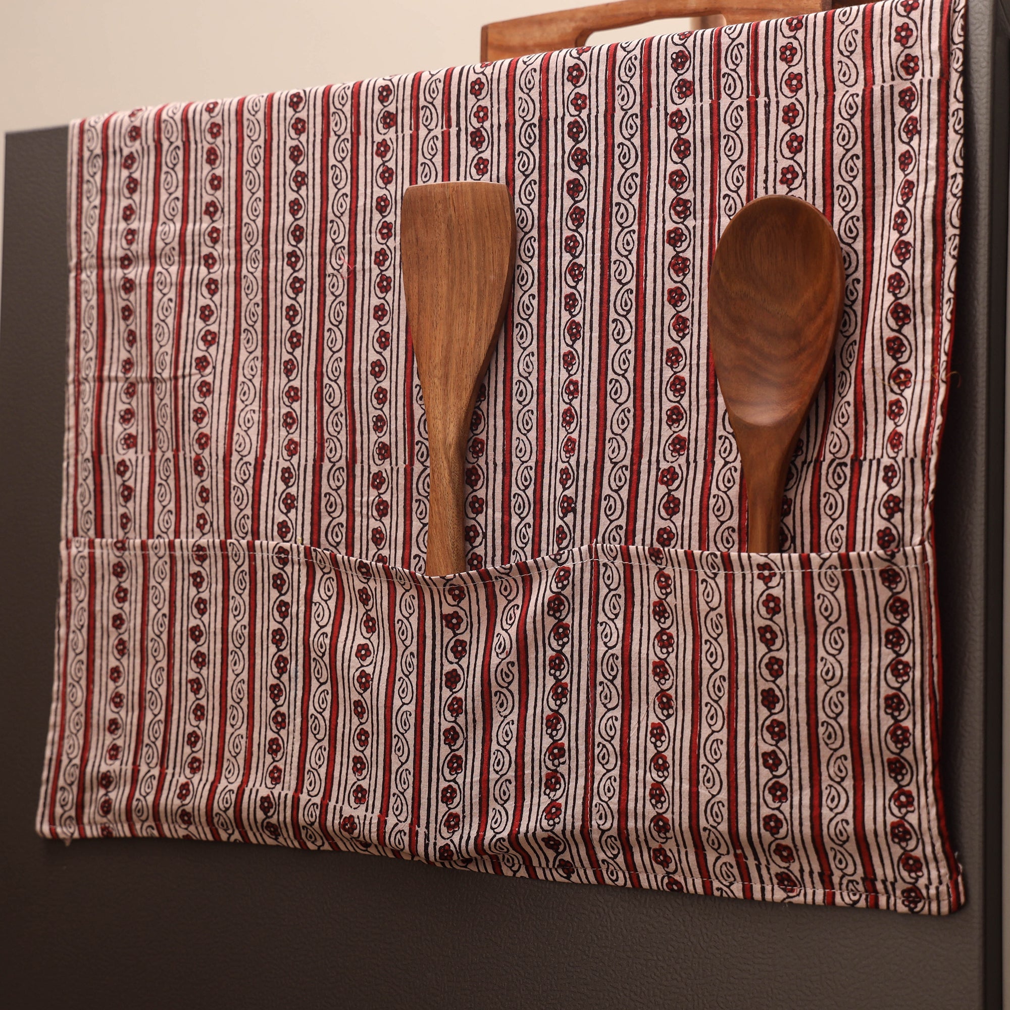 Handmade fridge top cover is made from artisanal indian cotton fabrics. It helps protect your fridge from dust, stains and everyday marks. The six stitched pockets provide convenient storage for small kitchen tools or other daily-use items.