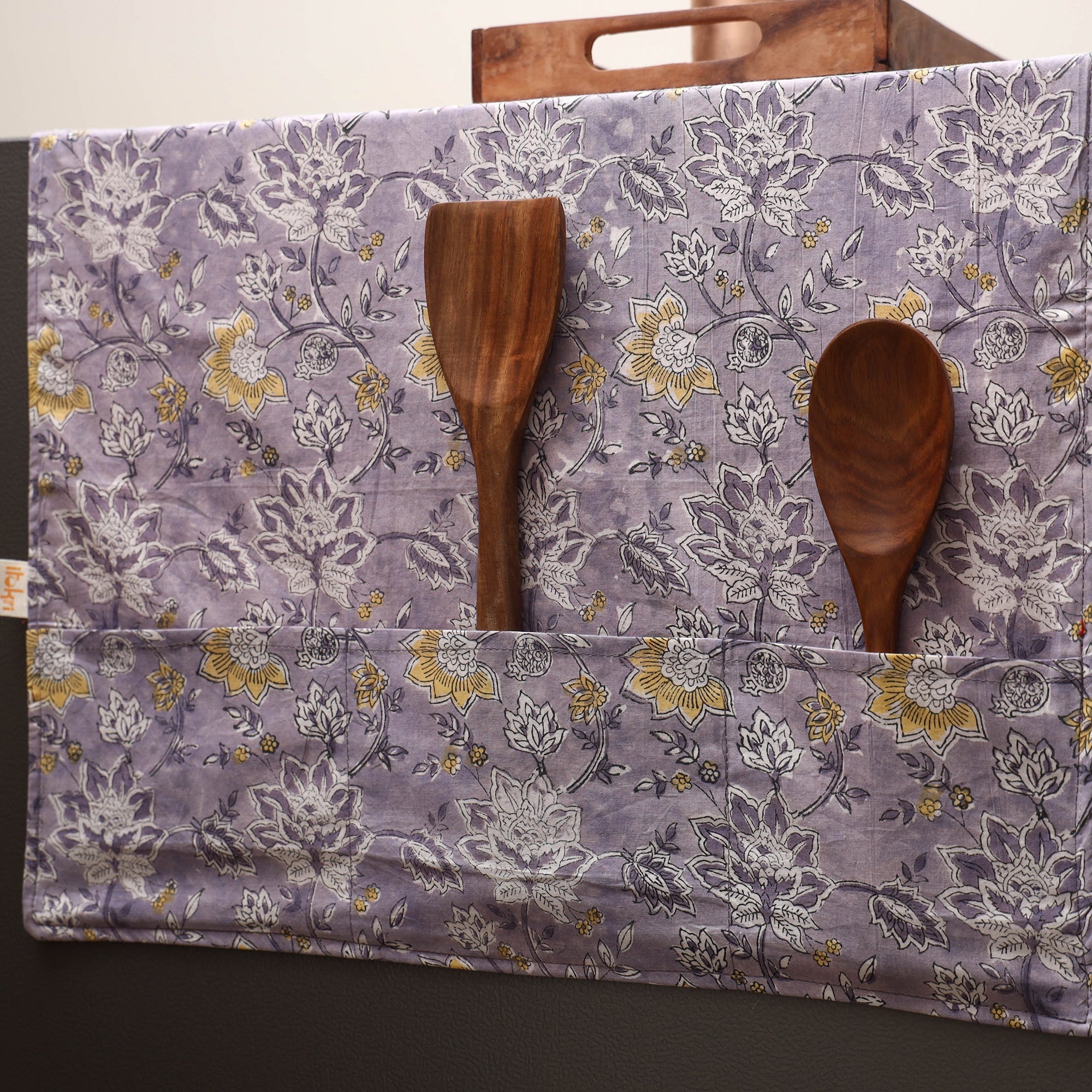 Handmade fridge top cover is made from sanganeri hand block print cotton fabric. It helps protect your fridge from dust, stains and everyday marks. The six stitched pockets provide convenient storage for small kitchen tools and other daily-use items.