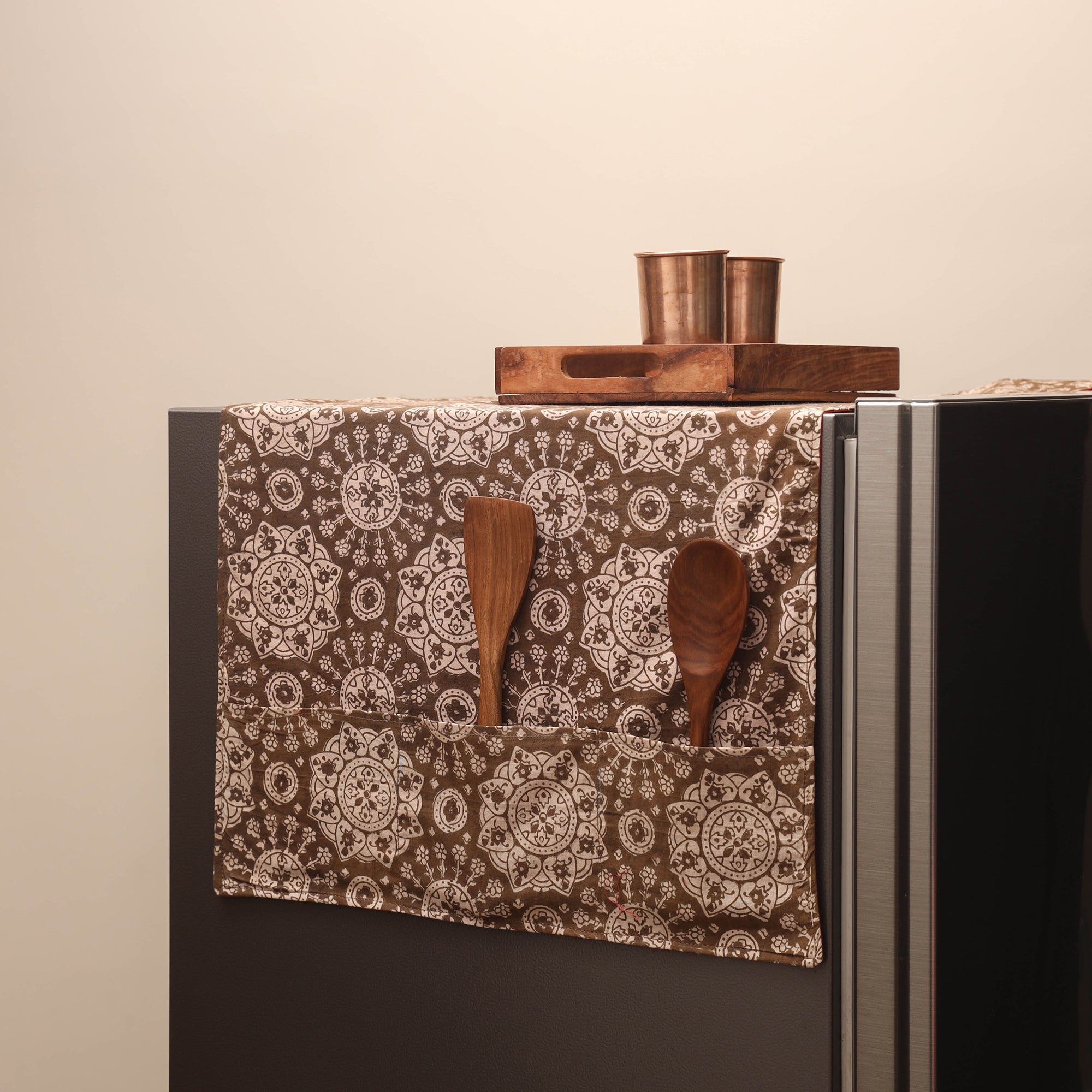 Handmade fridge top cover is made from artisanal indian cotton fabrics. It helps protect your fridge from dust, stains and everyday marks. The six stitched pockets provide convenient storage for small kitchen tools or other daily-use items.
