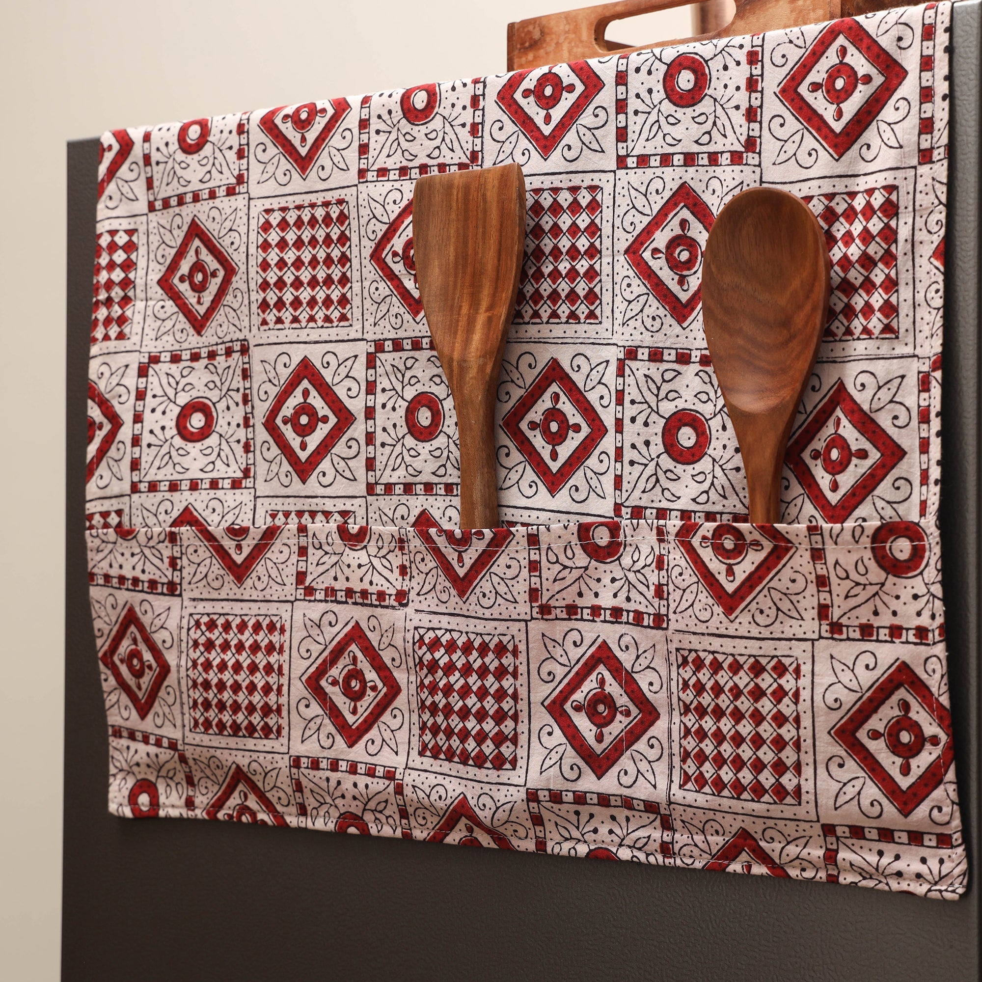 Beige fridge top cover is made from artisanal indian cotton fabrics. It helps protect your fridge from dust, stains, and everyday marks. The six stitched pockets provide convenient storage for small kitchen tools or other daily-use items.