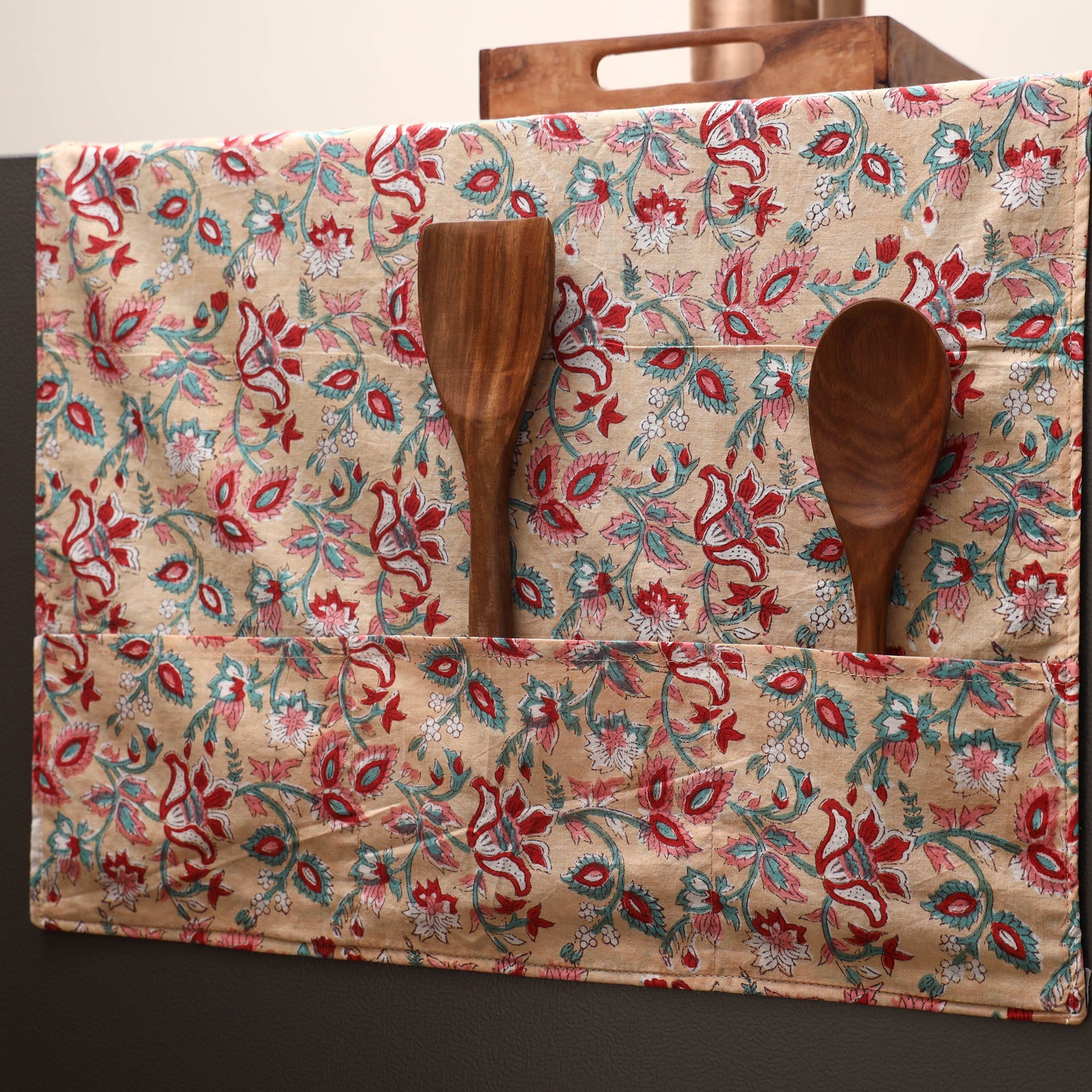 Handmade fridge top cover is made from sanganeri hand block print cotton fabric. It helps protect your fridge from dust, stains and everyday marks. The six stitched pockets provide convenient storage for small kitchen tools and other daily-use items.