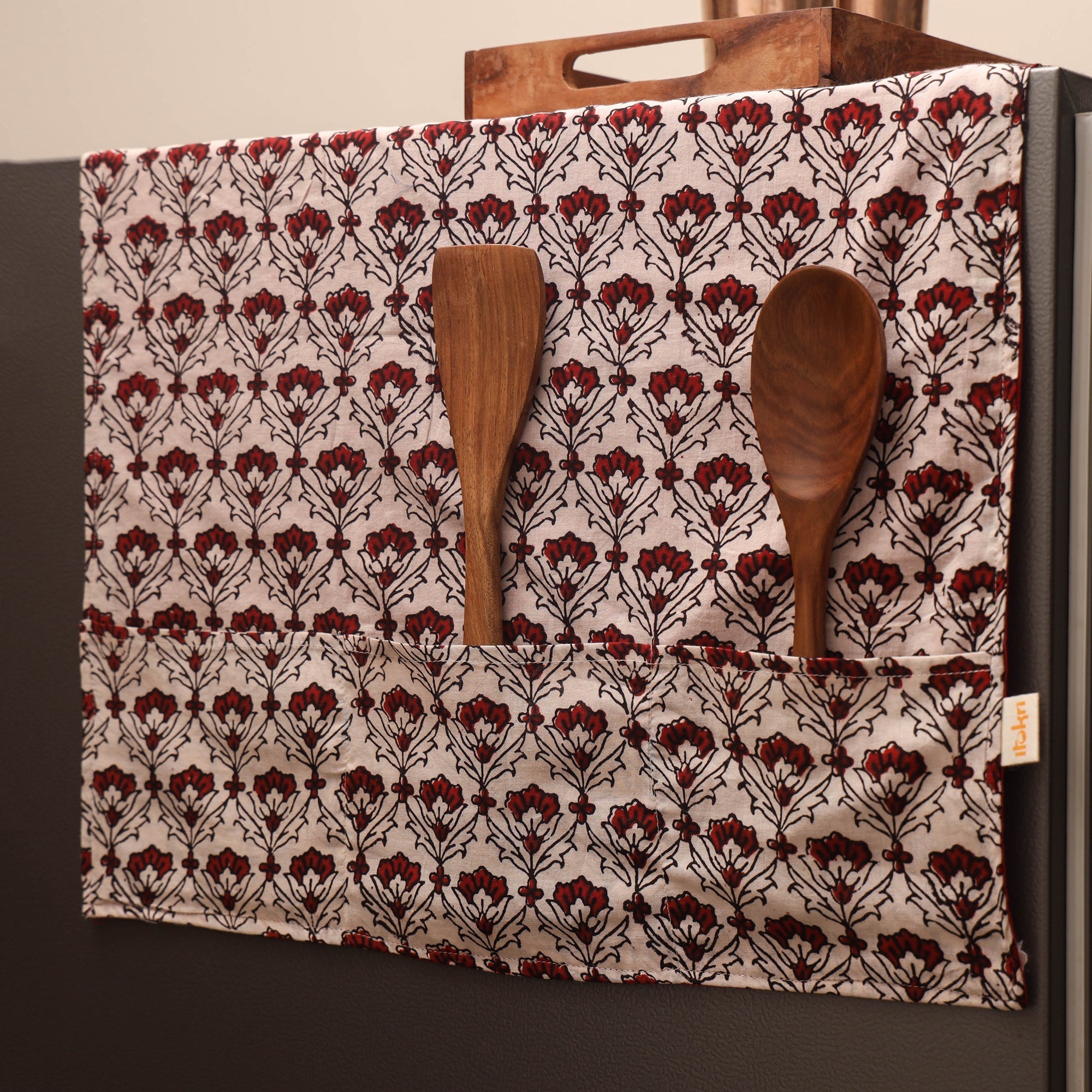 Beige handmade fridge top cover is made from artisanal indian cotton fabrics. It helps protect your fridge from dust, stains and everyday marks. The six stitched pockets provide convenient storage for small kitchen tools or other daily-use items.