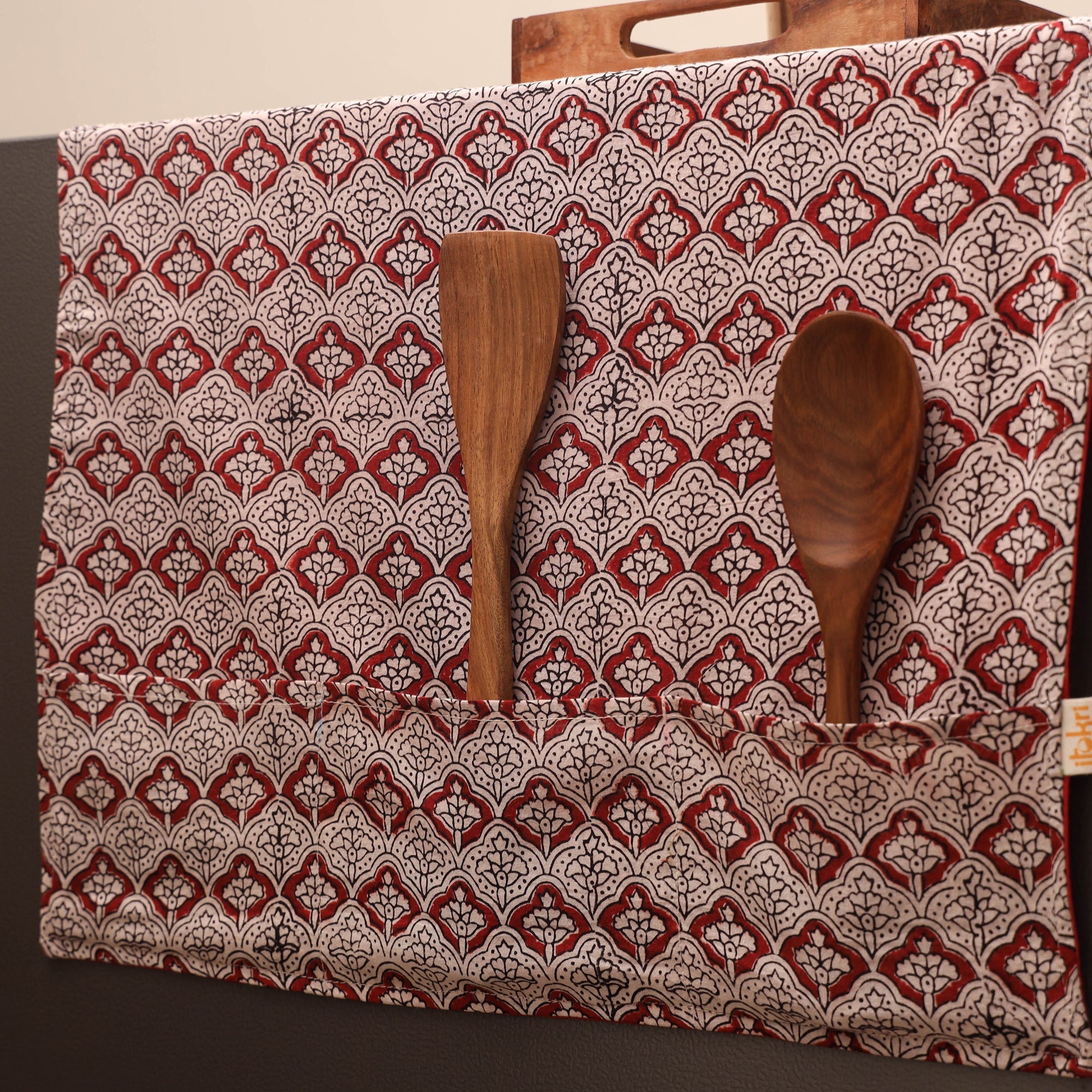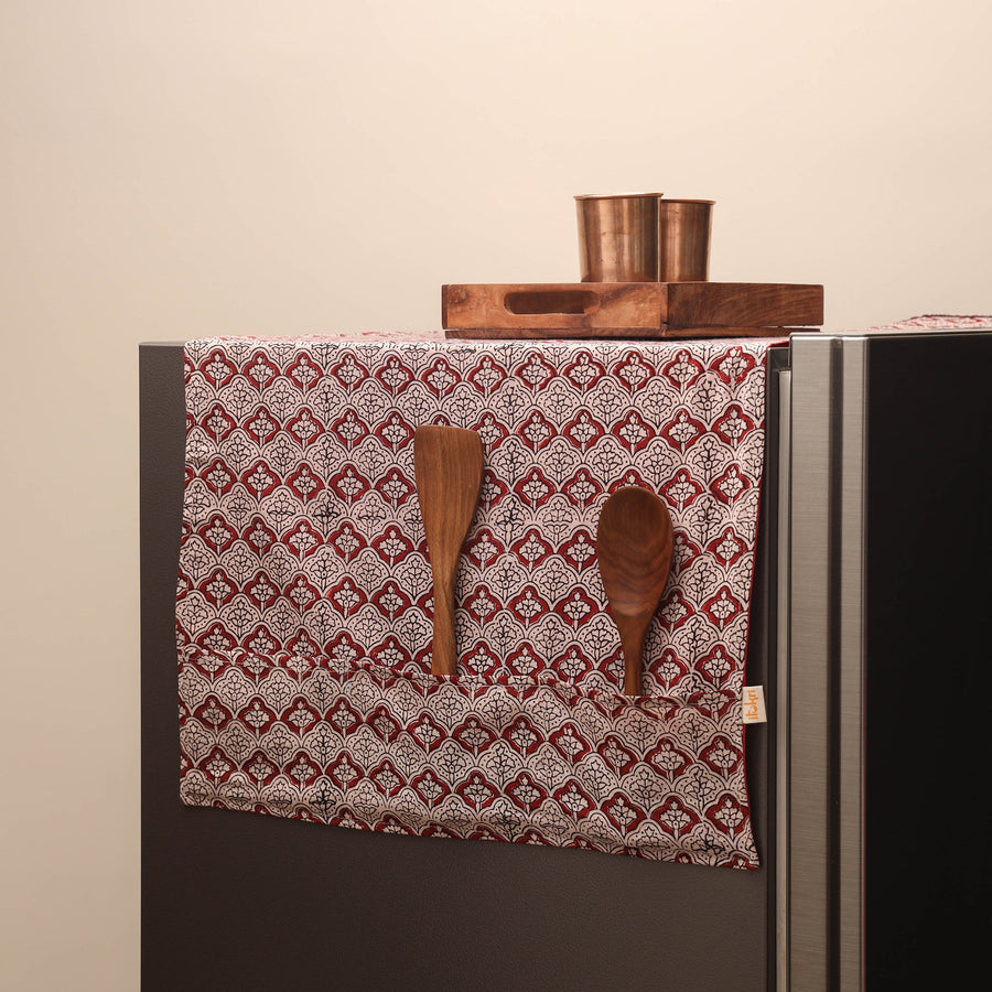 Handmade fridge top cover is made from artisanal indian cotton fabrics. It helps protect your fridge from dust, stains and everyday marks. The six stitched pockets provide convenient storage for small kitchen tools or other daily-use items.