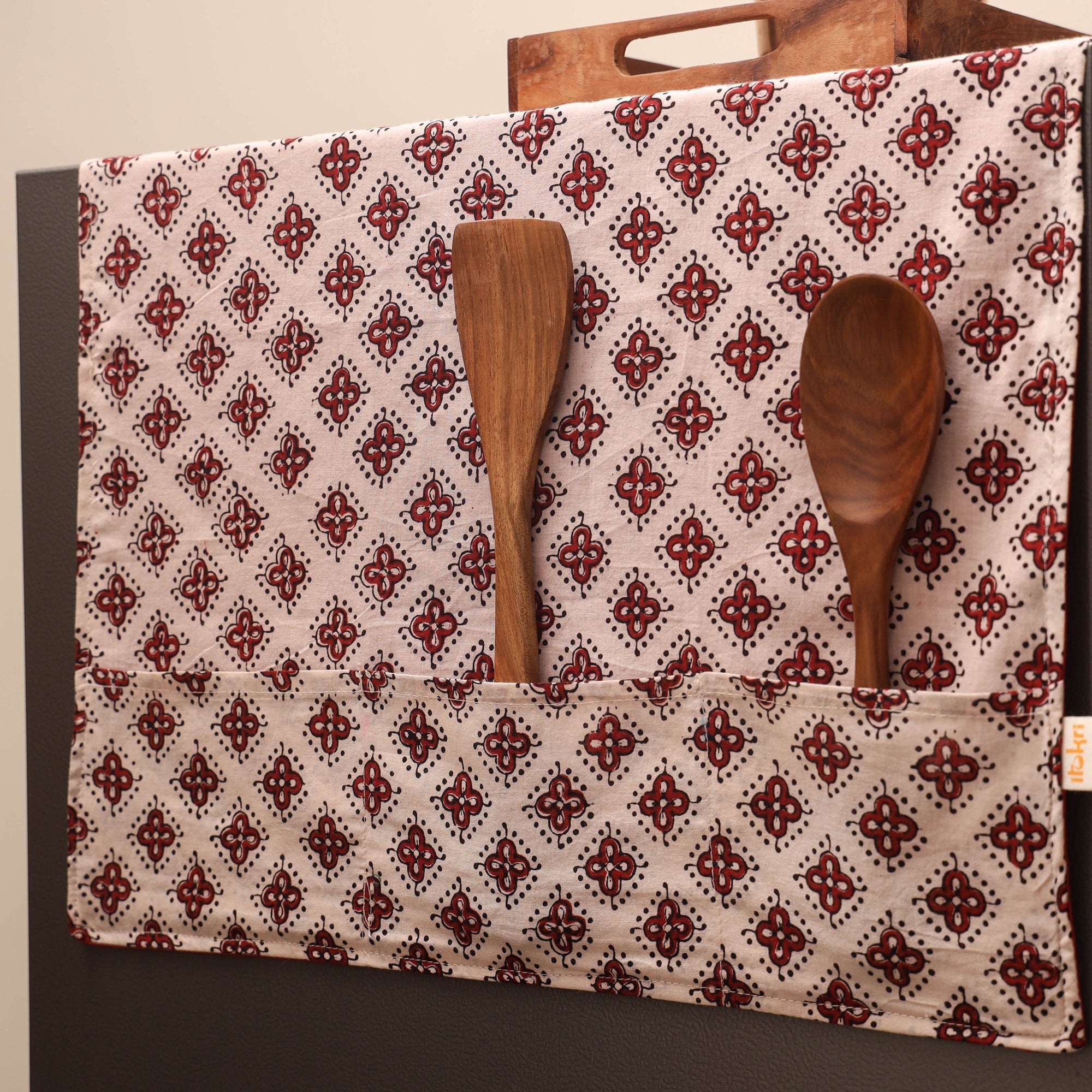 Beige handmade fridge top cover is made from artisanal indian cotton fabrics. It helps protect your fridge from dust, stains and everyday marks. The six stitched pockets provide convenient storage for small kitchen tools or other daily-use items.