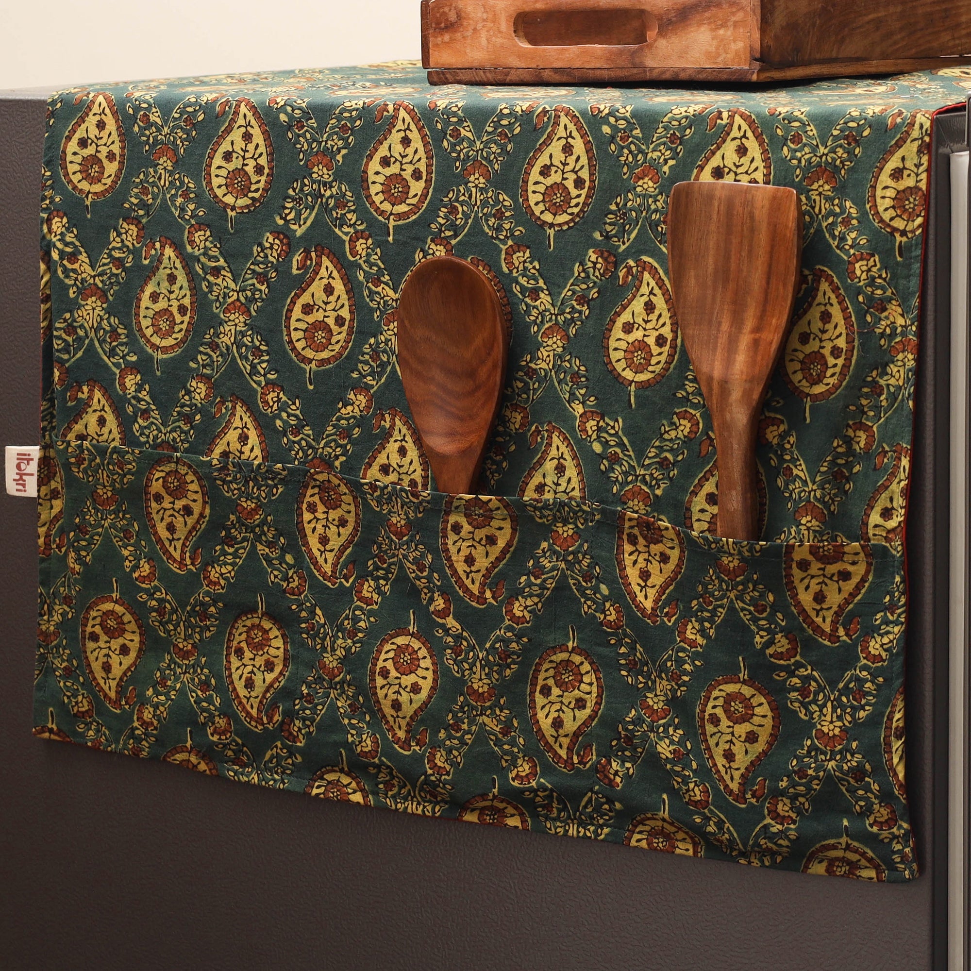 | Material | handmade fridge top cover in cotton, designed for everyday kitchen needs. This cover helps protect the surface from dust, spills and marks. Made from Indian handcrafted textiles, it features six stitched pockets provide convenient storage for small kitchen tools and other daily use items. This lightweight fridge top cover is crafted from leftover fabrics that were simply too pretty to waste. Sustainable and stylish, it helps reduce waste while adding a pop of personality to your daily routine. |
