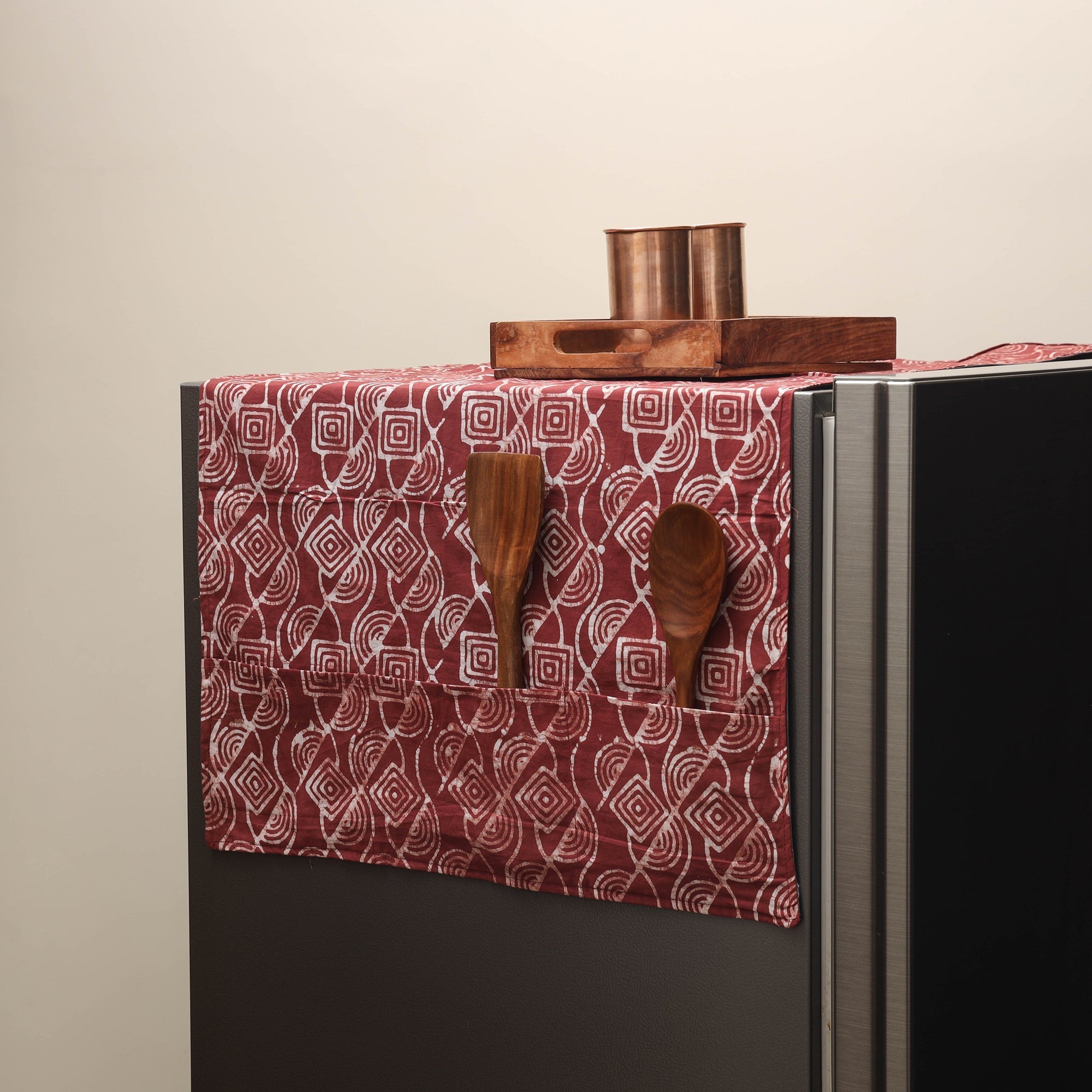 Maroon fridge top cover is made from artisanal indian cotton fabrics. It helps protect your fridge from dust, stains, and everyday marks. The six stitched pockets provide convenient storage for small kitchen tools or other daily-use items.