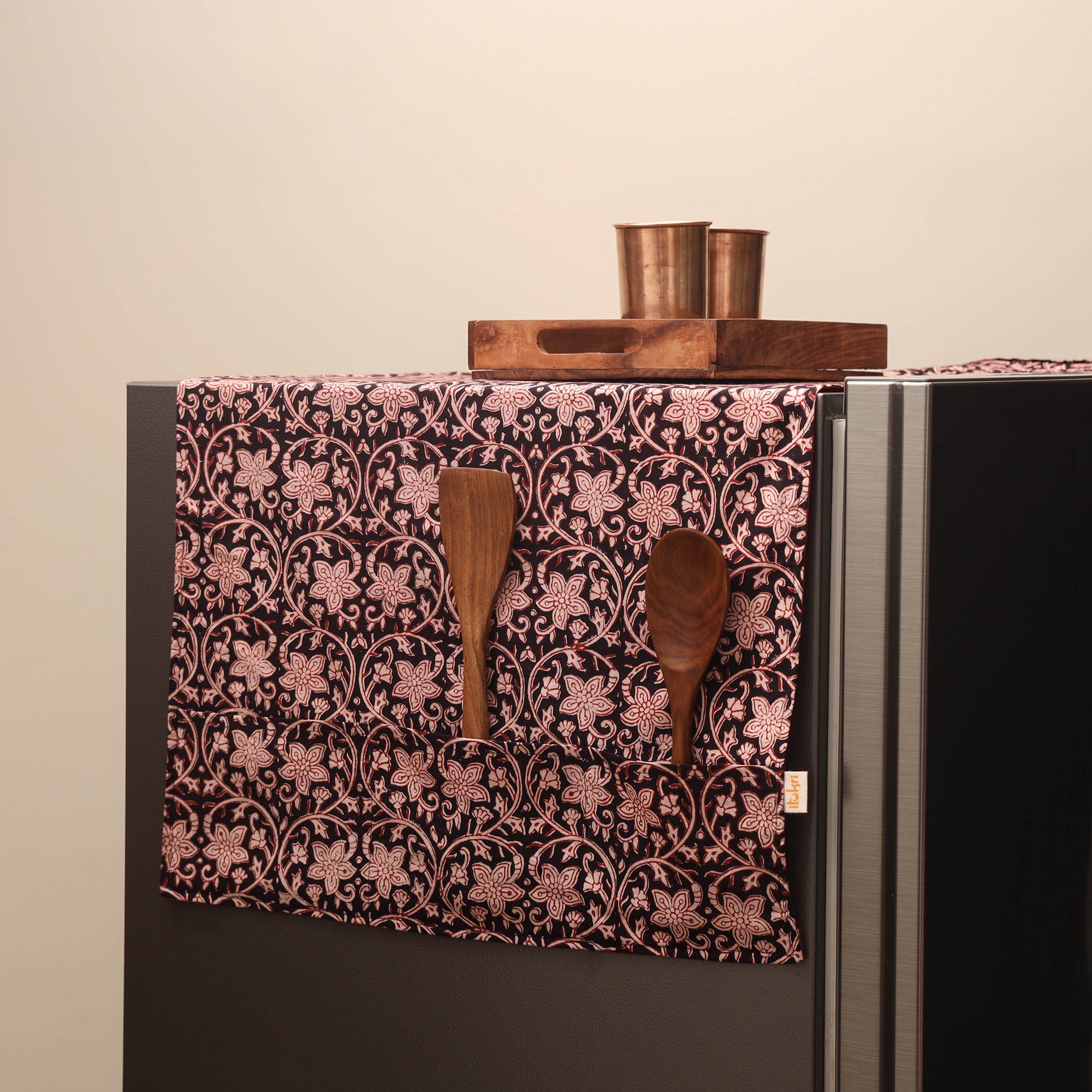 Handmade fridge top cover is made from artisanal indian cotton fabrics. It helps protect your fridge from dust, stains and everyday marks. The six stitched pockets provide convenient storage for small kitchen tools or other daily-use items.