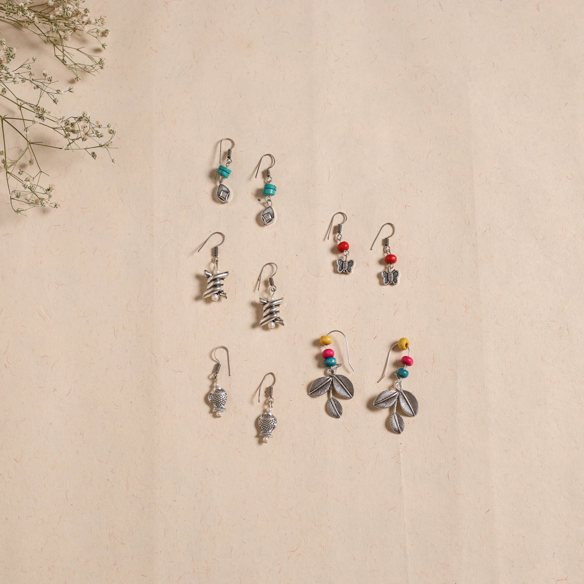 This set of 5 multicolor handmade earrings is crafted with german silver and beads. Each pair has a different design, making it easy to match with daily wear or festive outfits. A useful addition to your jewellery box or a nice gift option.